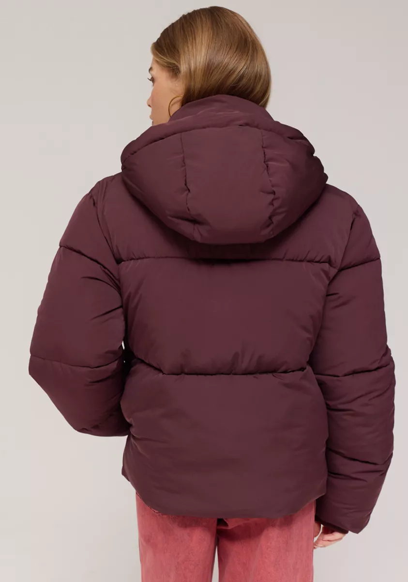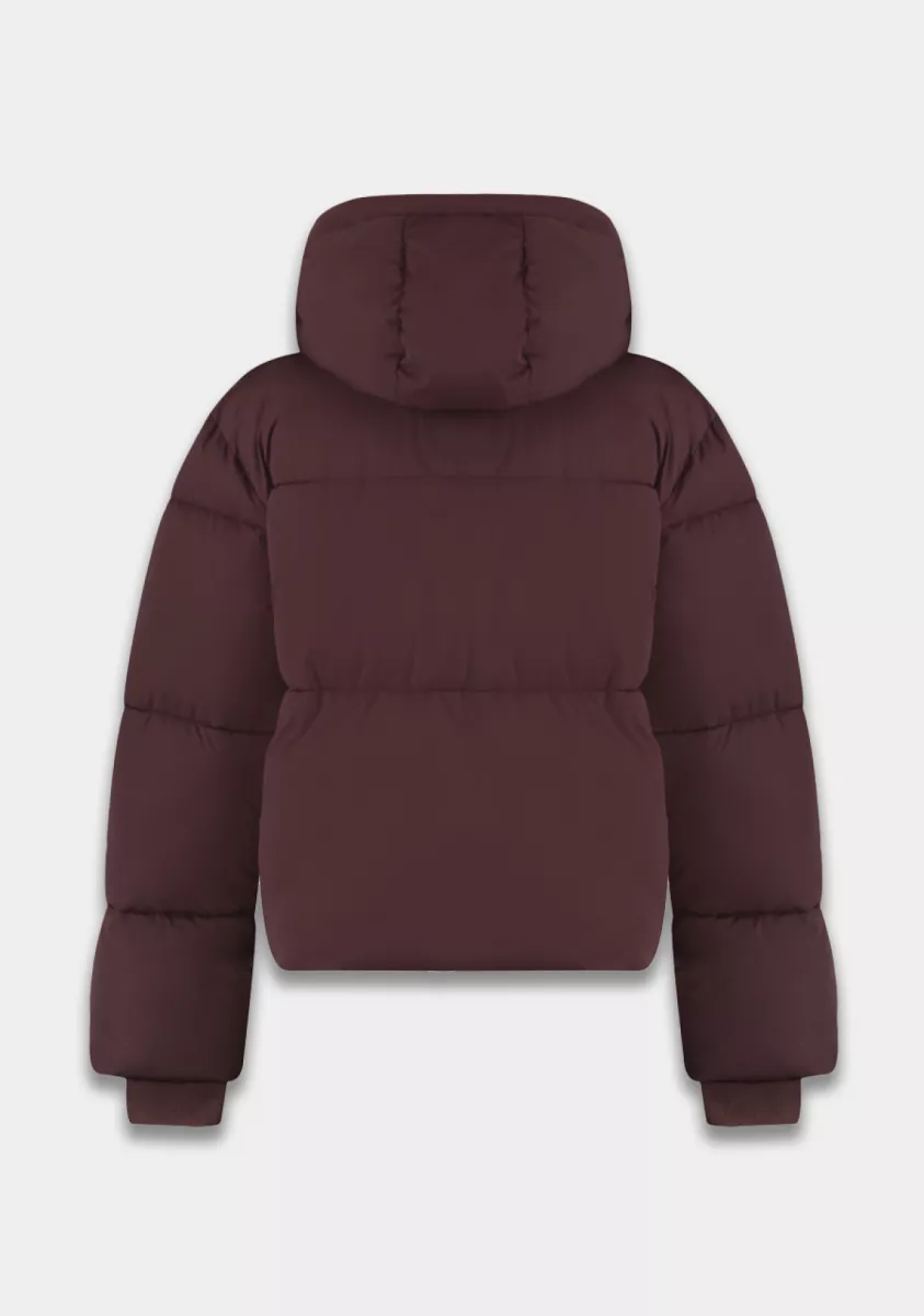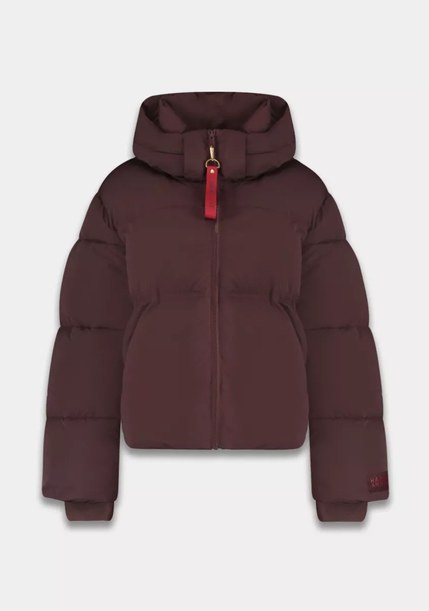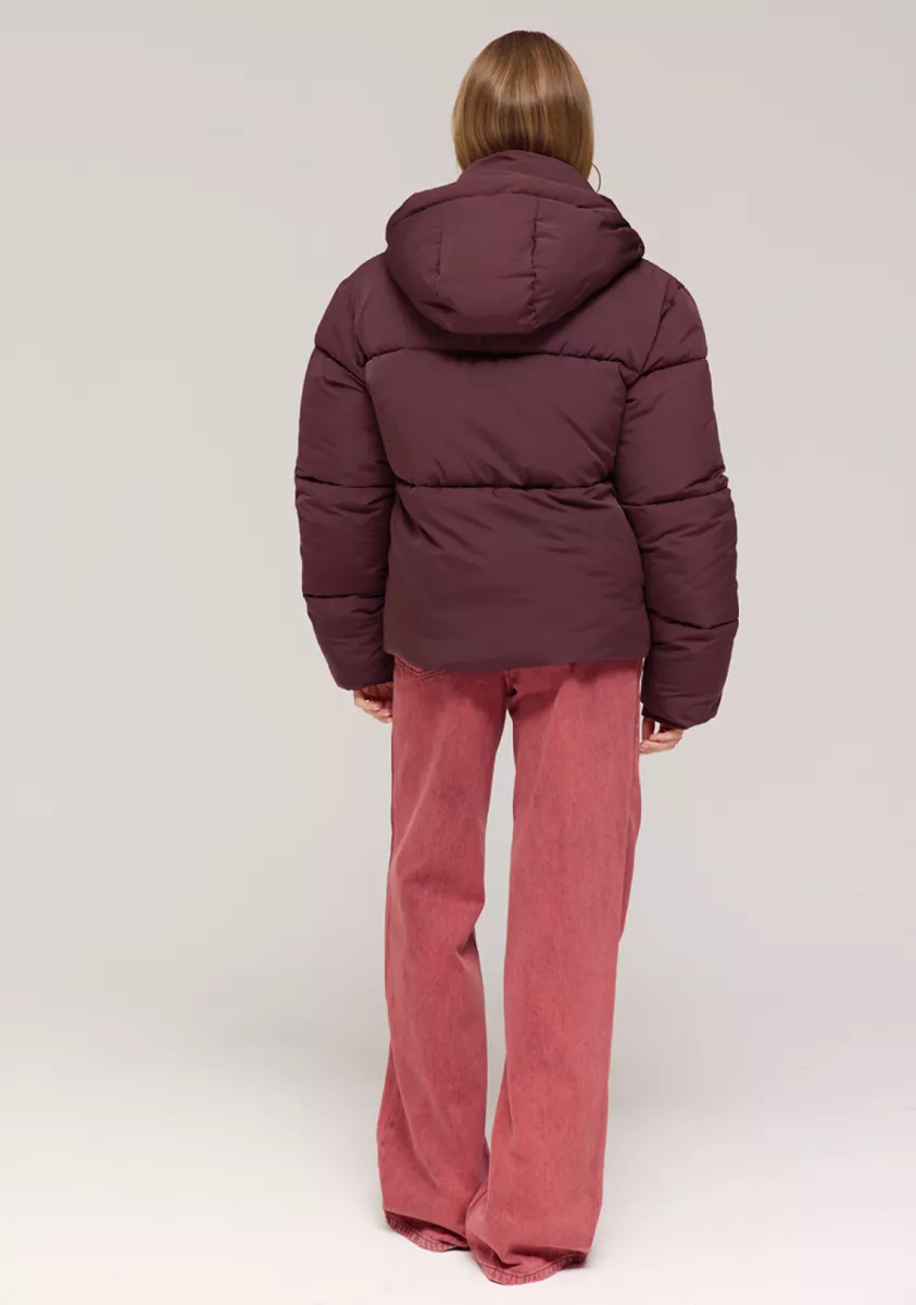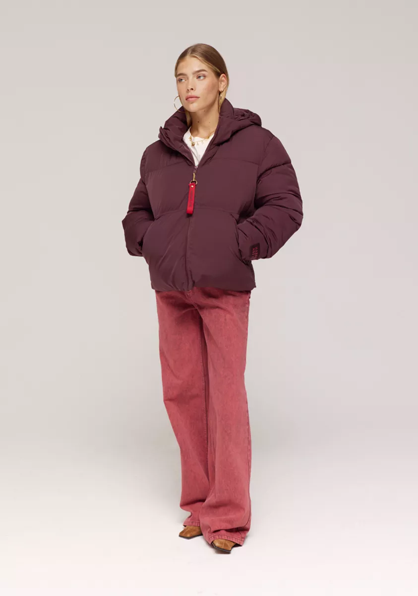 Shop de Harper & Yve Karly winterjas. Warme bordeauxrode dames pufferjas met capuchon, gewatteerd design en trendy rode zipper puller. Perfect voor stijlvolle winterlooks.