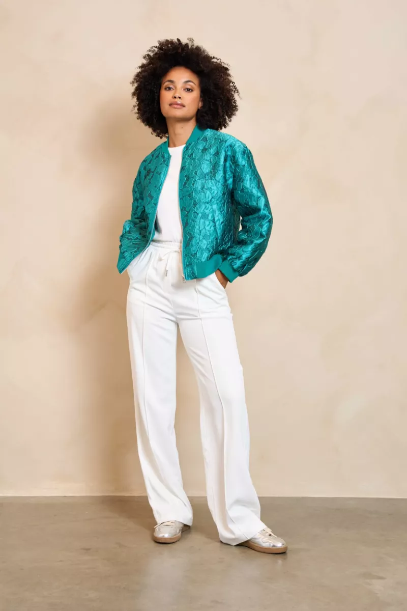 Dit teal bomber jack voor dames is verrassend veelzijdig. Draag Jacket Alvee casual met een basic T-shirt en jeans voor een stoere everyday look, of combineer ‘m met een elegante top en pantalon voor een meer geklede outfit. Ook prachtig over een jurk voor een speels contrast. Door de opvallende structuur en kleur heeft dit jasje weinig extra’s nodig — het jasje doet het werk voor je.