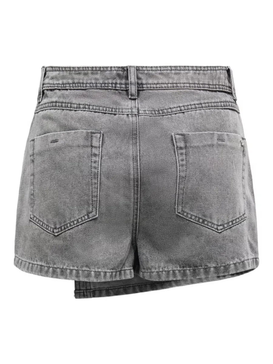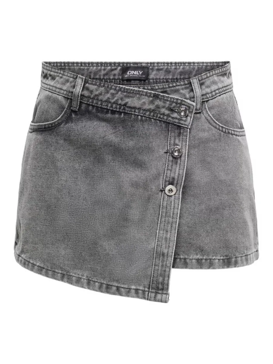 De ONLLESLY denim skort van ONLY is een trendy musthave met een stoere twist. Deze grijze denim skort combineert de look van een rokje met het comfort van een short. De asymmetrische overslag met knoopdetails geeft het item een edgy en fashionable uitstraling. De mid waist fit en de stevige katoenen denim zorgen voor een fijne pasvorm en maken dit item perfect voor elke dag.