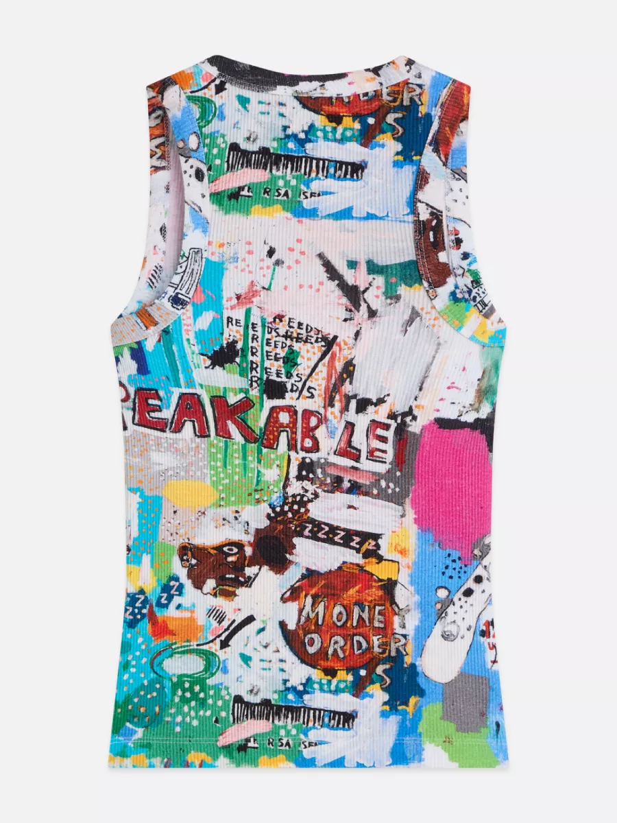 Deze rib racer tank is perfect voor zomerse, edgy looks. Combineer ‘m met een loose fit jeans of denim shorts voor een nonchalante outfit. Ook heel sterk onder een blazer of oversized jasje, waarbij de kleurrijke Basquiat print echt naar voren komt. Draag ‘m casual met sneakers of geef je look extra attitude met sandalen of boots. Dit item is ideaal voor wie houdt van uitgesproken fashion met een creatieve twist.