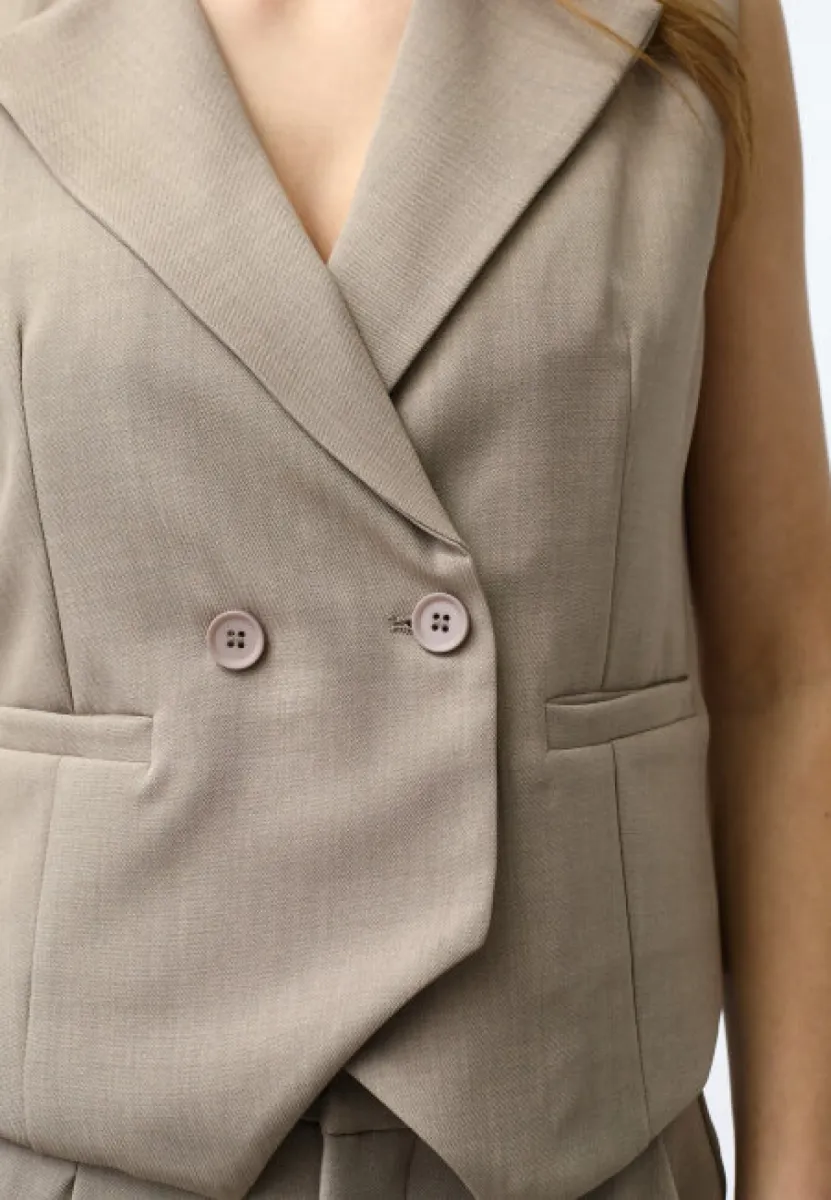 De GREAT-NEW.VE van SisterS Point is een stijlvol gilet met een elegante, tailored uitstraling. Dit item heeft een cropped pasvorm en is afgewerkt met een dubbele knoopsluiting en brede revers, wat zorgt voor een krachtige en vrouwelijke look. De zandkleur geeft het gilet een rustige en luxe uitstraling, waardoor je het moeiteloos combineert met verschillende outfits. De subtiele steekzakken en de mooie fit maken dit item perfect voor zowel casual als meer geklede momenten.