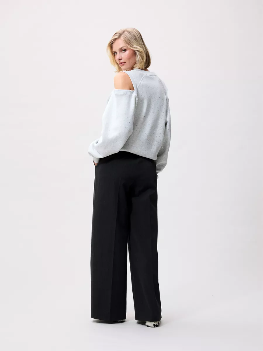 Deze zachte sweater is bezaaid met strass steentjes en heeft een losvallende pasvorm met open shouder.