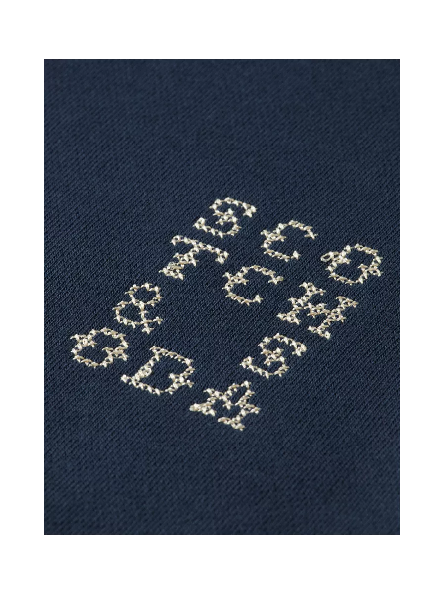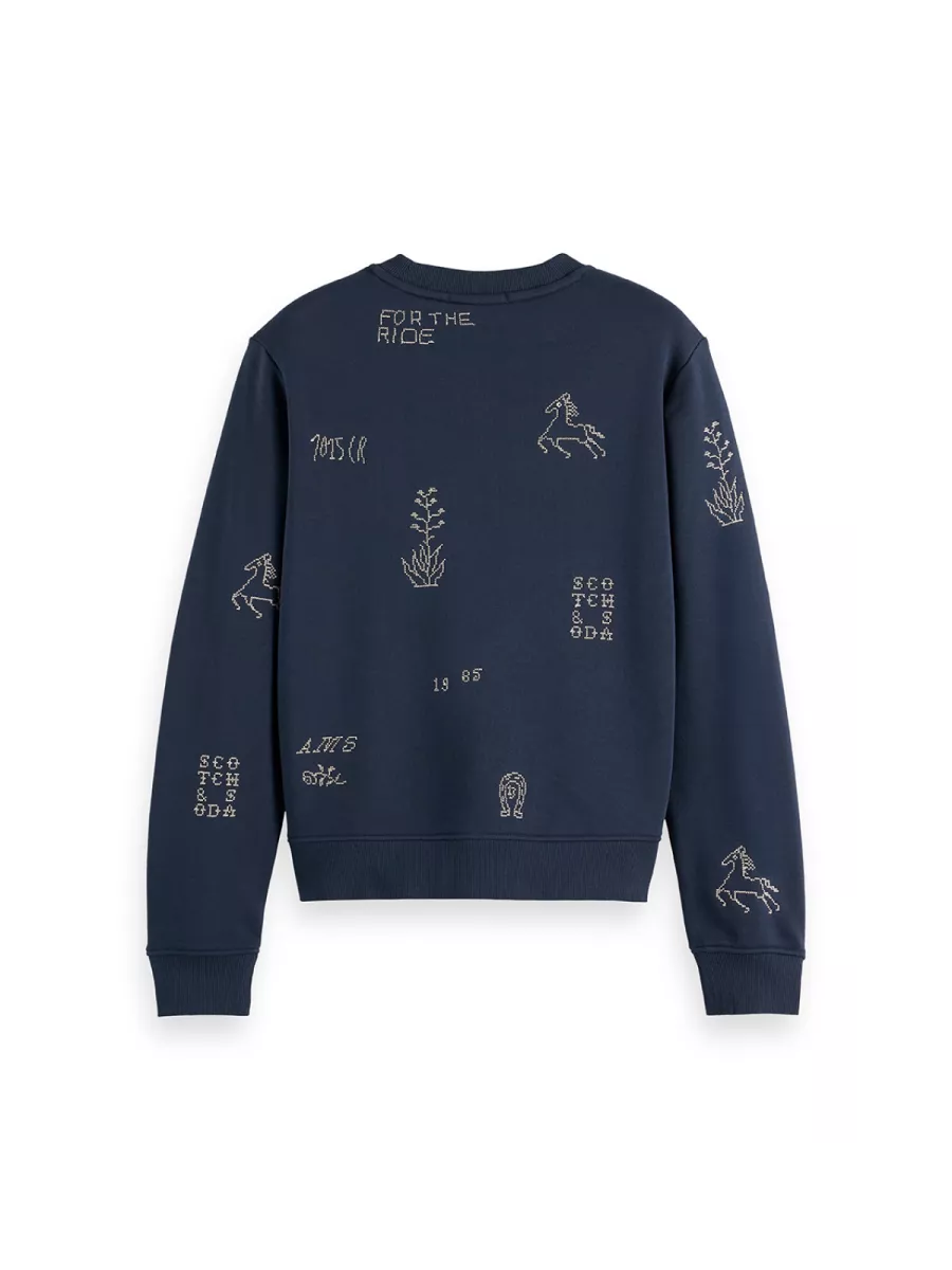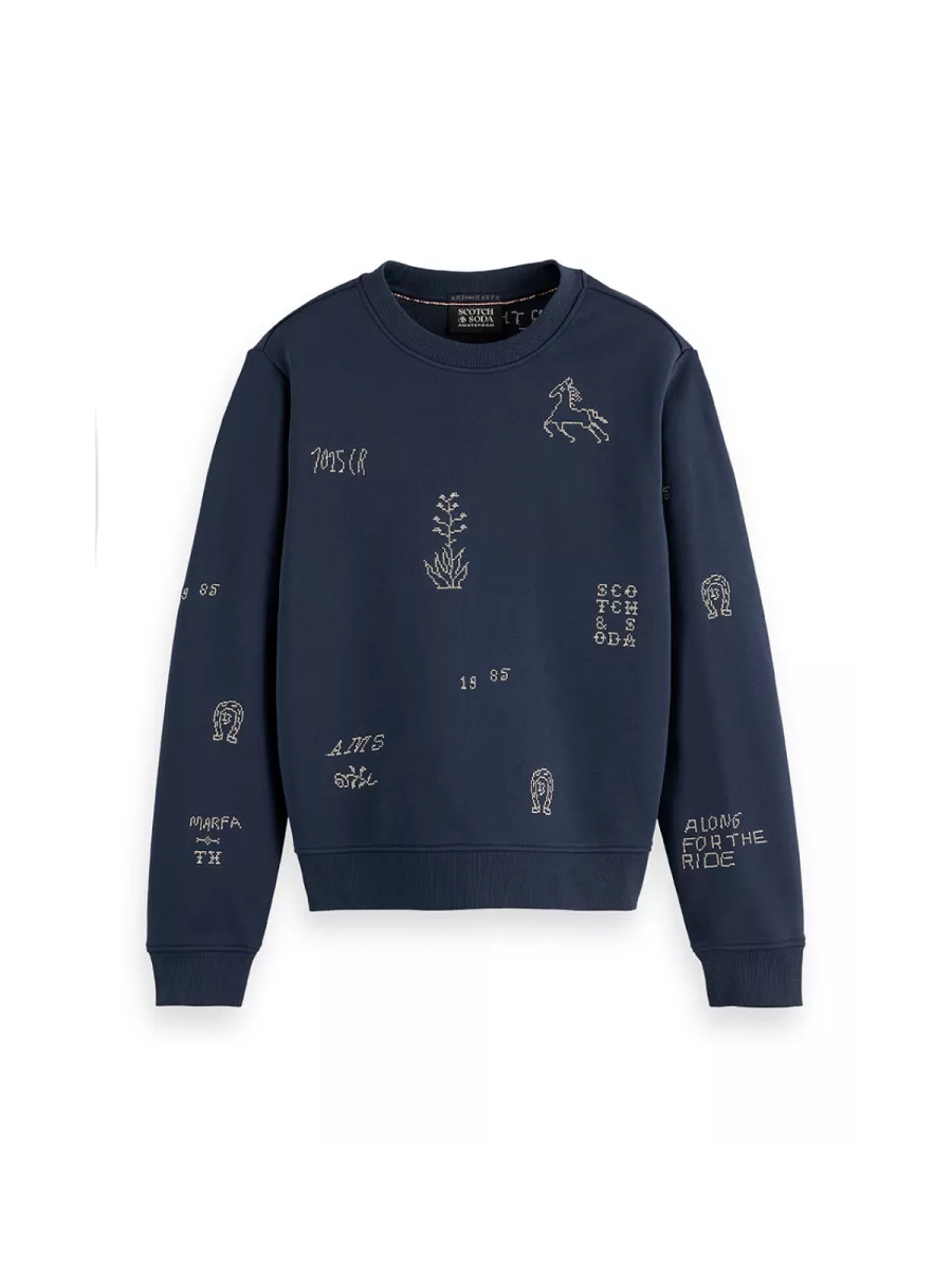 Deze donkerblauwe Scotch & Soda sweater is een eigentijds item met subtiele, geborduurde details die de trui een unieke en speelse uitstraling geven. De paardjes, symbolen en tekstaccenten zorgen voor een verrassende twist, typisch voor de creatieve stijl van Scotch & Soda. Dankzij de zachte stofkwaliteit met 85% katoen en 15% polyester voelt de sweater comfortabel en stevig aan, ideaal voor dagelijks gebruik én voor laagjes in het tussenseizoen.