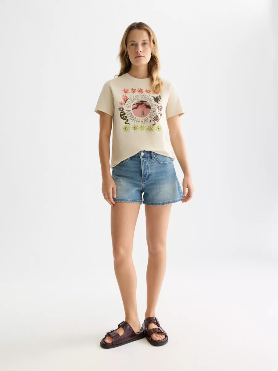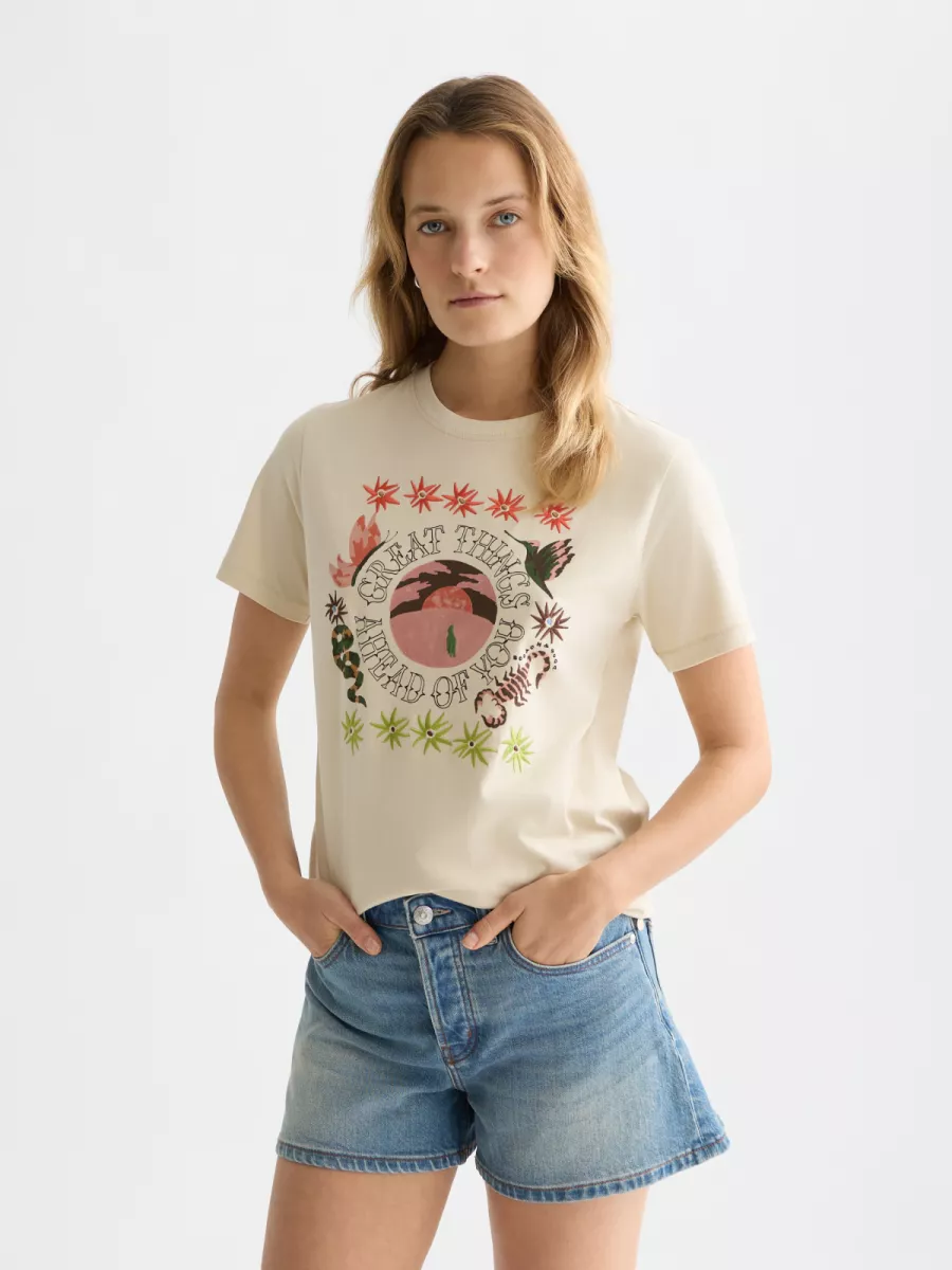Door de neutrale kleur en het kleurrijke artwork is dit dames T-shirt een veelzijdig item dat in veel outfits tot zijn recht komt.