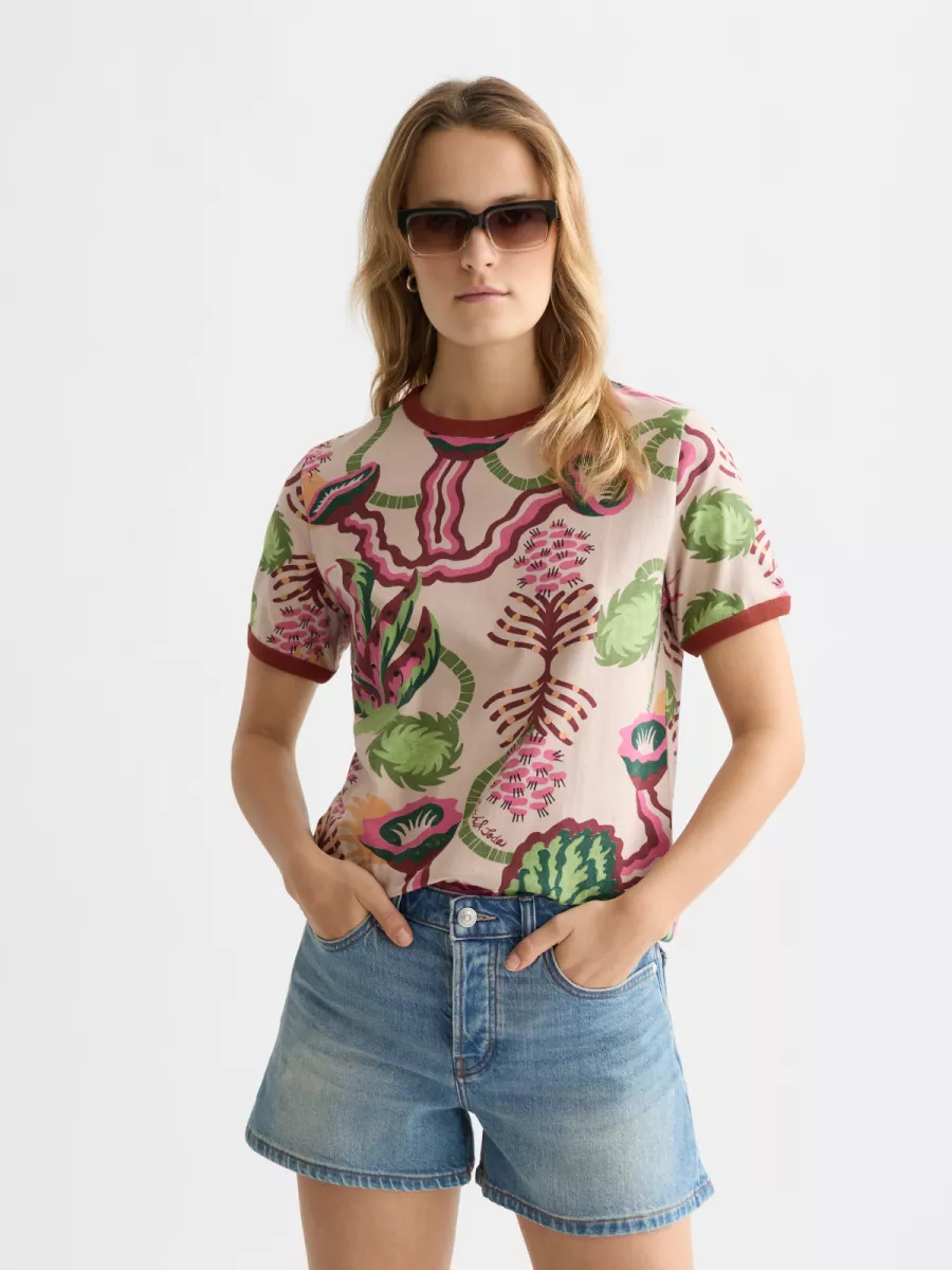De kleurrijke print maakt het shirt ideaal om te dragen met neutrale basics, zodat het T-shirt echt de eyecatcher van je outfit wordt.
