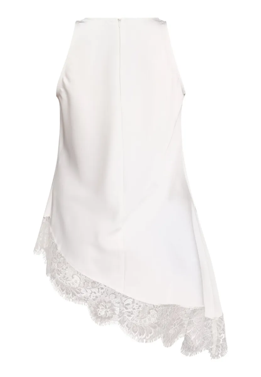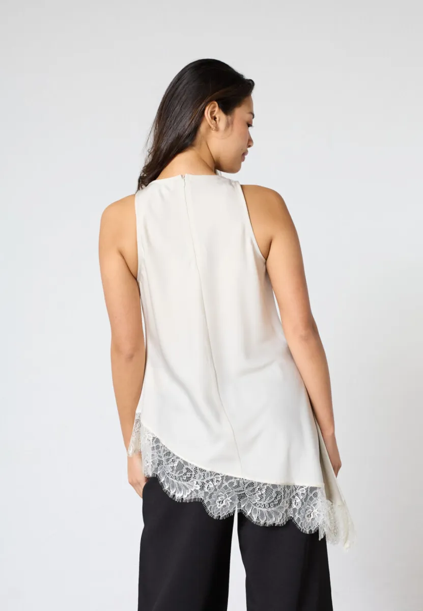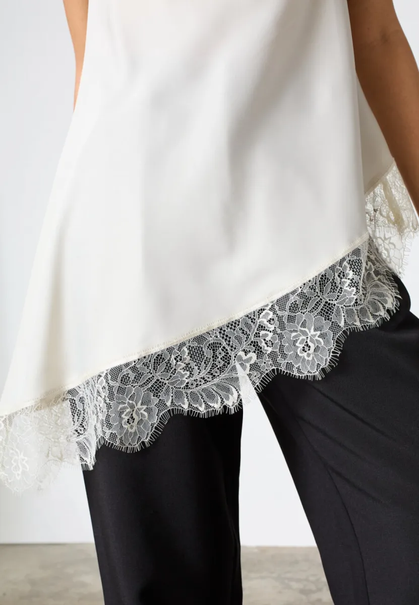 De VIOL-TA top van SisterS Point is een elegante en vrouwelijke top met een luxe uitstraling. De satijnlook stof in een zachte cream kleur zorgt voor een verfijnde basis, terwijl de asymmetrische onderkant met kanten rand een speels en chic detail toevoegt. De mouwloze fit en ronde hals geven de top een minimalistische uitstraling, waardoor het item perfect in balans is tussen eenvoudig en bijzonder.