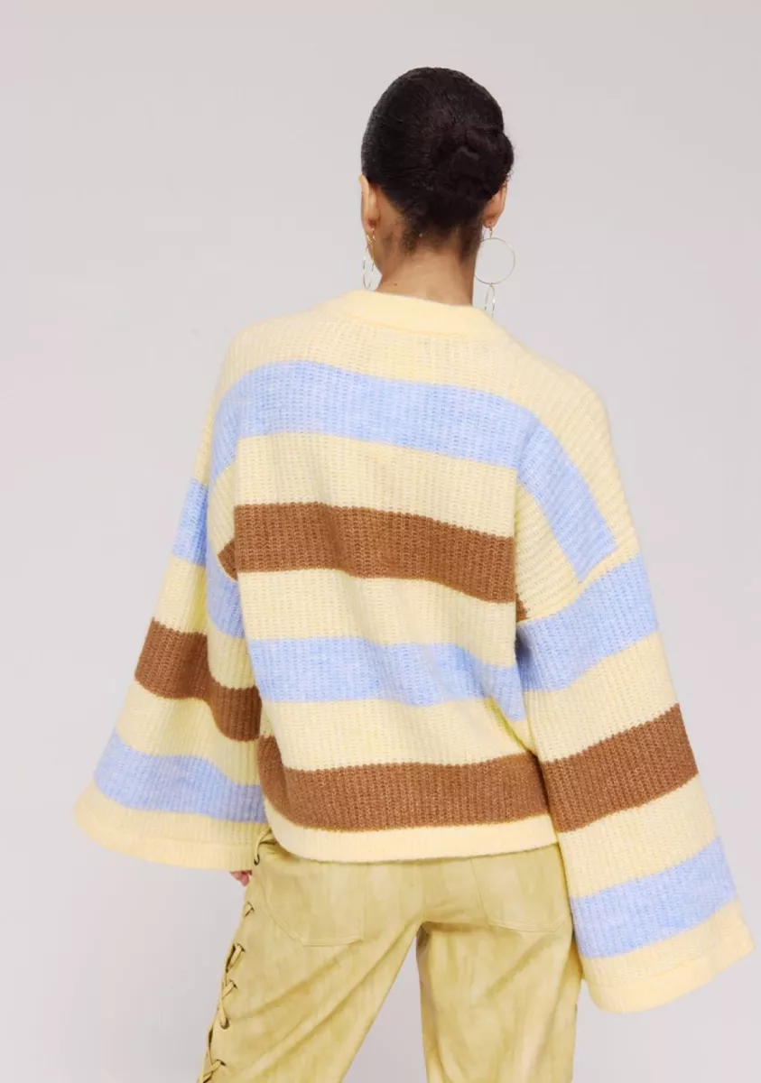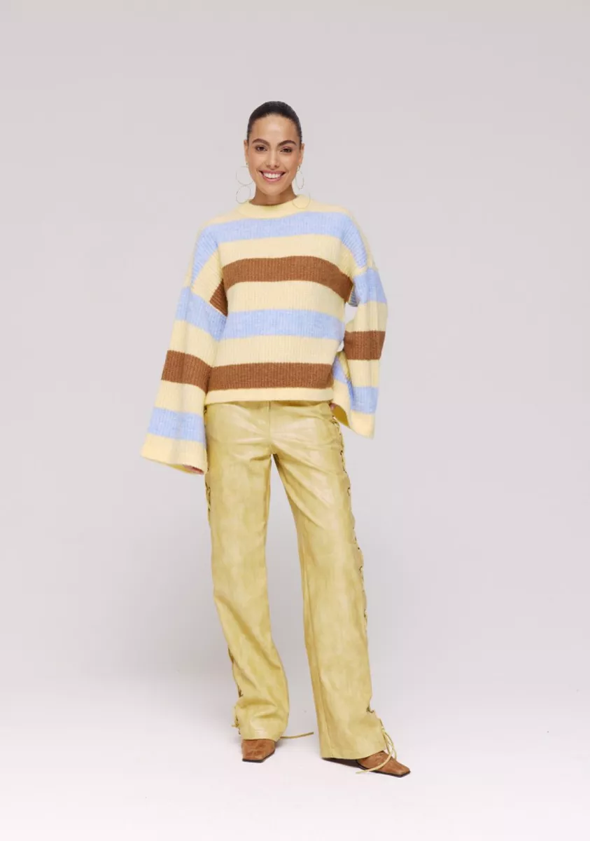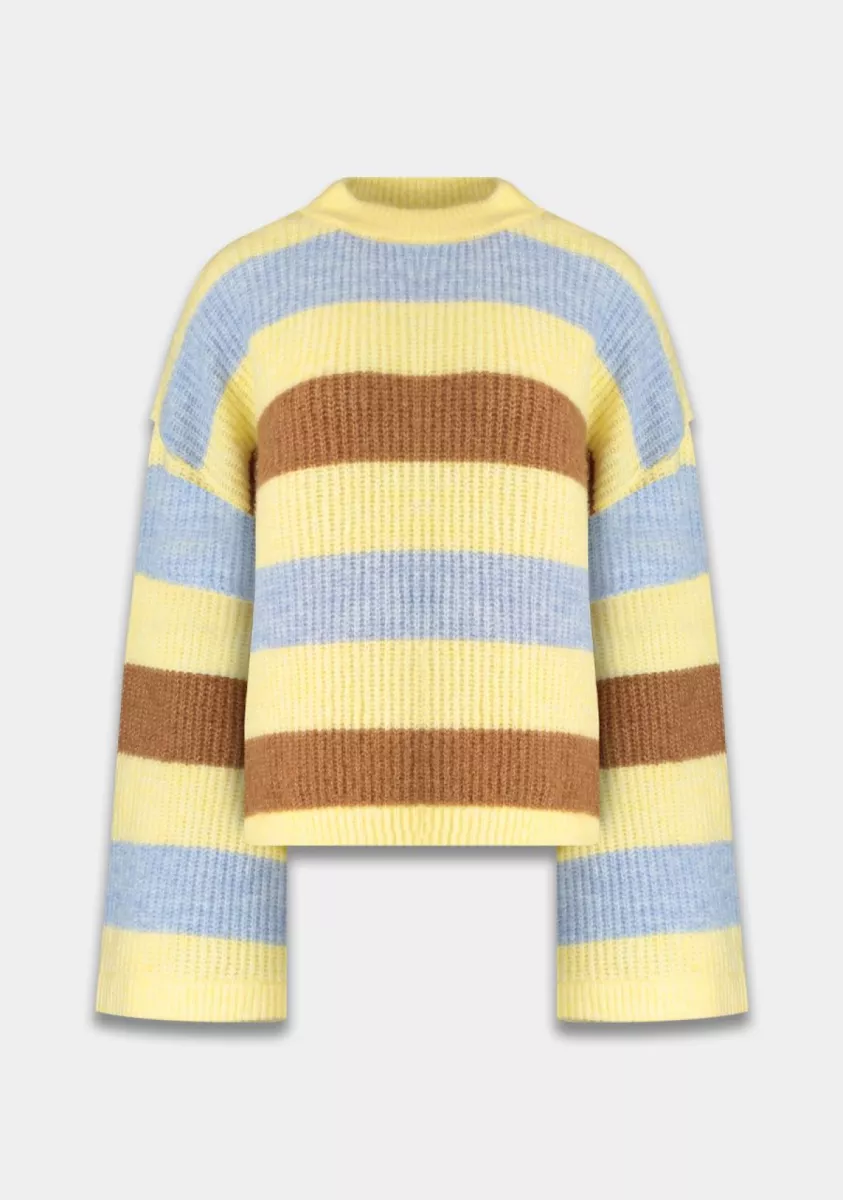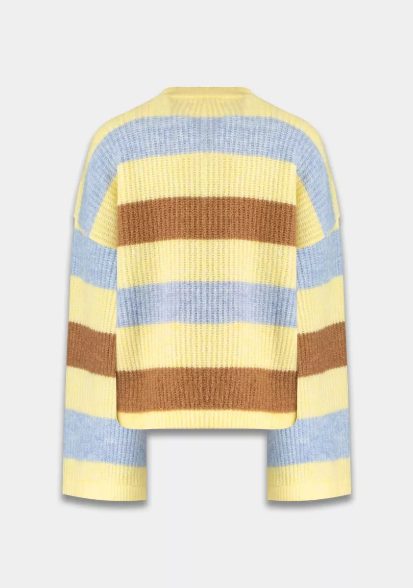 ALEX-JU MULTI STRIPE YELLOW Color your day with stripes. De ALEX jumper met multi stripe yellow is een knit vol energie. De mix van gerecycled polyester, acryl en wol zorgt voor warmte zachtheid.