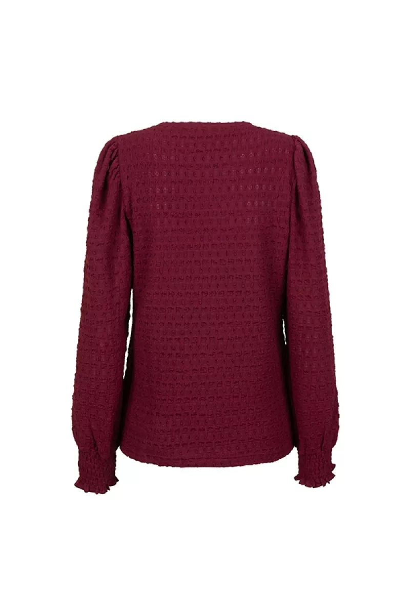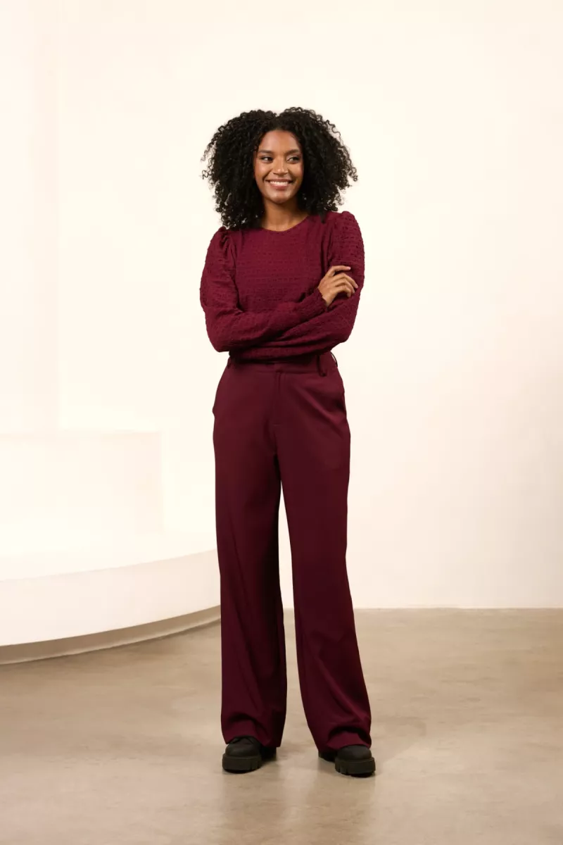 Top Thyrsa is een bordeauxrode top met structuurstof. De top heeft een hoge ronde hals, pofmouwen en smockdetails bij de mouwuiteinden. De rode top bevat veel stretch en is qua pasvorm rechtvallend.