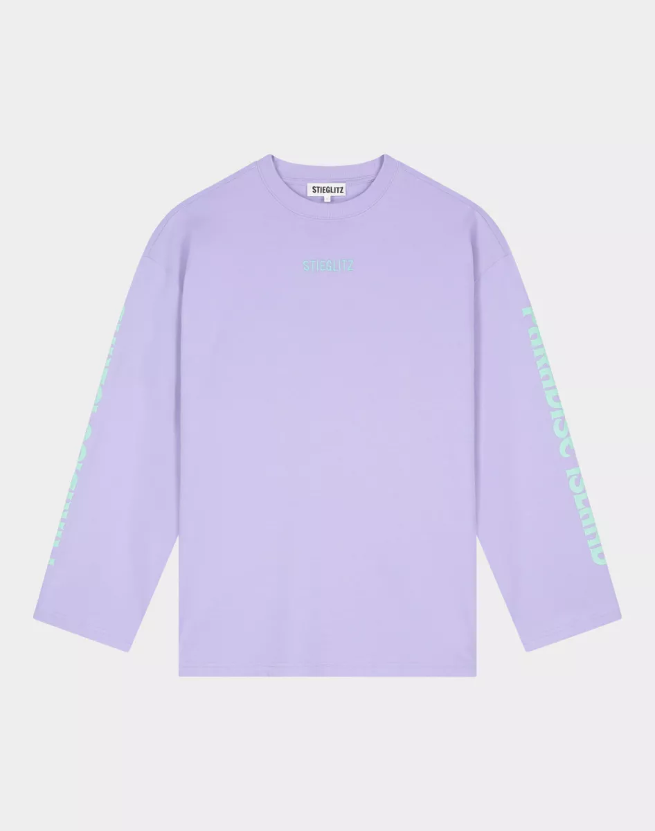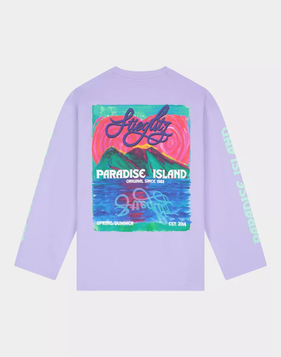De Fanna Wide Skate Longsleeve van Stieglitz is een opvallende longsleeve met een creatieve en kleurrijke uitstraling. Deze paarse longsleeve heeft een relaxed wide fit met wijde mouwen, wat zorgt voor een comfortabele en moderne streetstyle look. Op de borst staat een subtiel Stieglitz logo, terwijl de achterkant wordt gedomineerd door een groot Paradise Island artwork met levendige kleuren en grafische details.