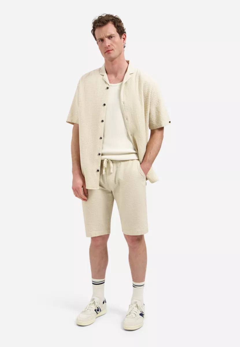 Wat deze short bijzonder maakt, is de subtiele jacquard structuur in de stof. Dit geeft het item net wat extra diepte en een luxe uitstraling zonder dat het te druk wordt. De regular fit en elastische tailleband met koordsluiting zorgen voor een perfecte balans tussen comfort en een verzorgde look. Ideaal voor zomerse dagen, vakanties en relaxte momenten.
