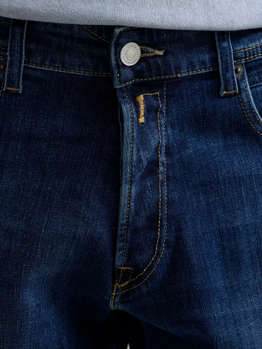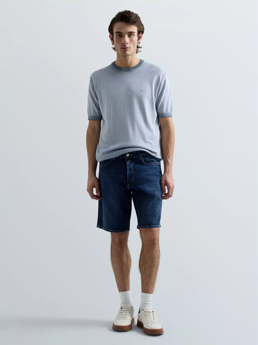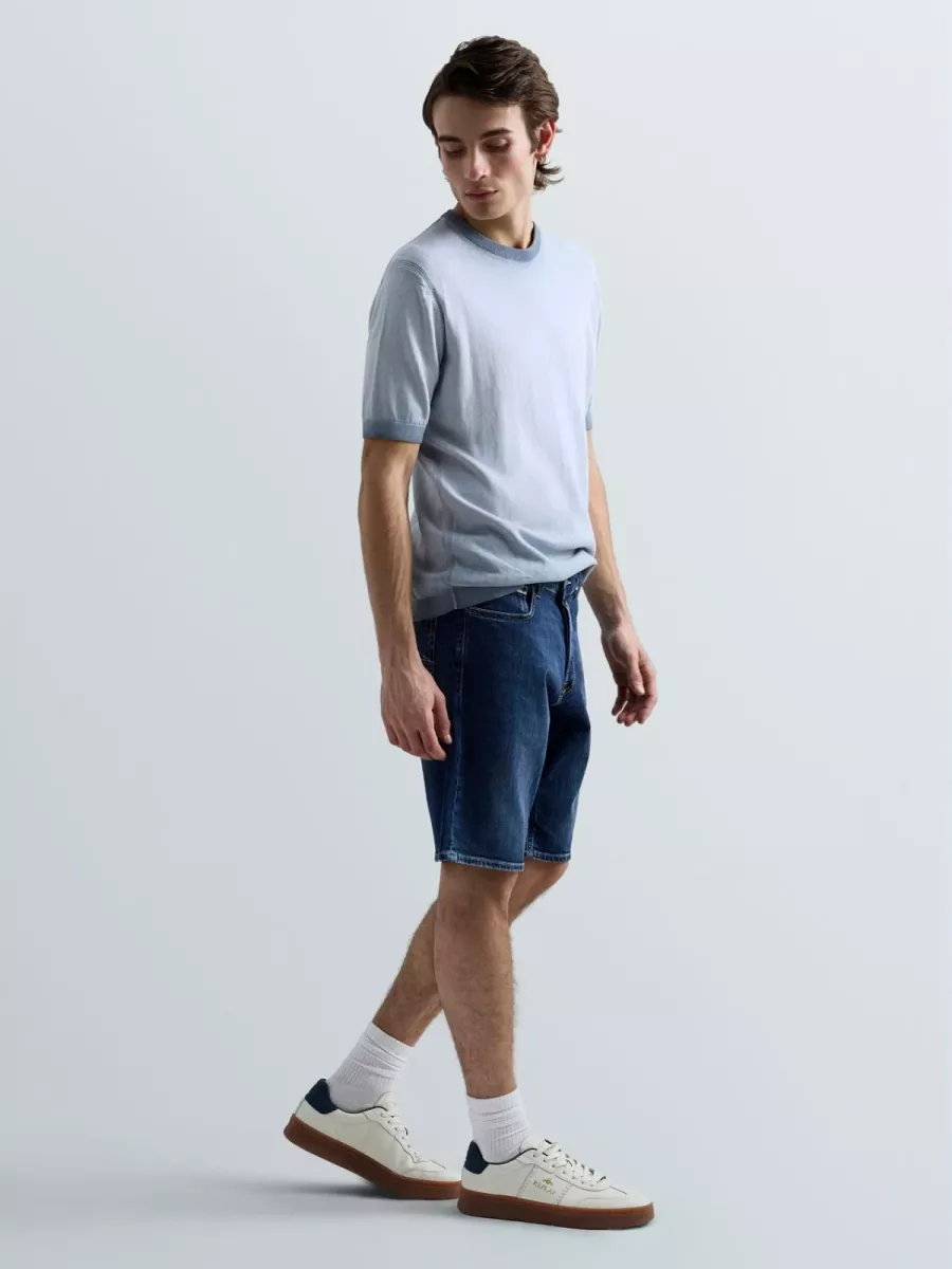 De short is gemaakt van 11 oz stretch denim van biologisch katoen, waardoor hij stevig aanvoelt maar toch voldoende bewegingsvrijheid biedt. De donkerblauwe wassing met subtiele stone wash, whiskers en lichte slijtage-effecten geeft deze korte broek een gedragen en karaktervolle look.