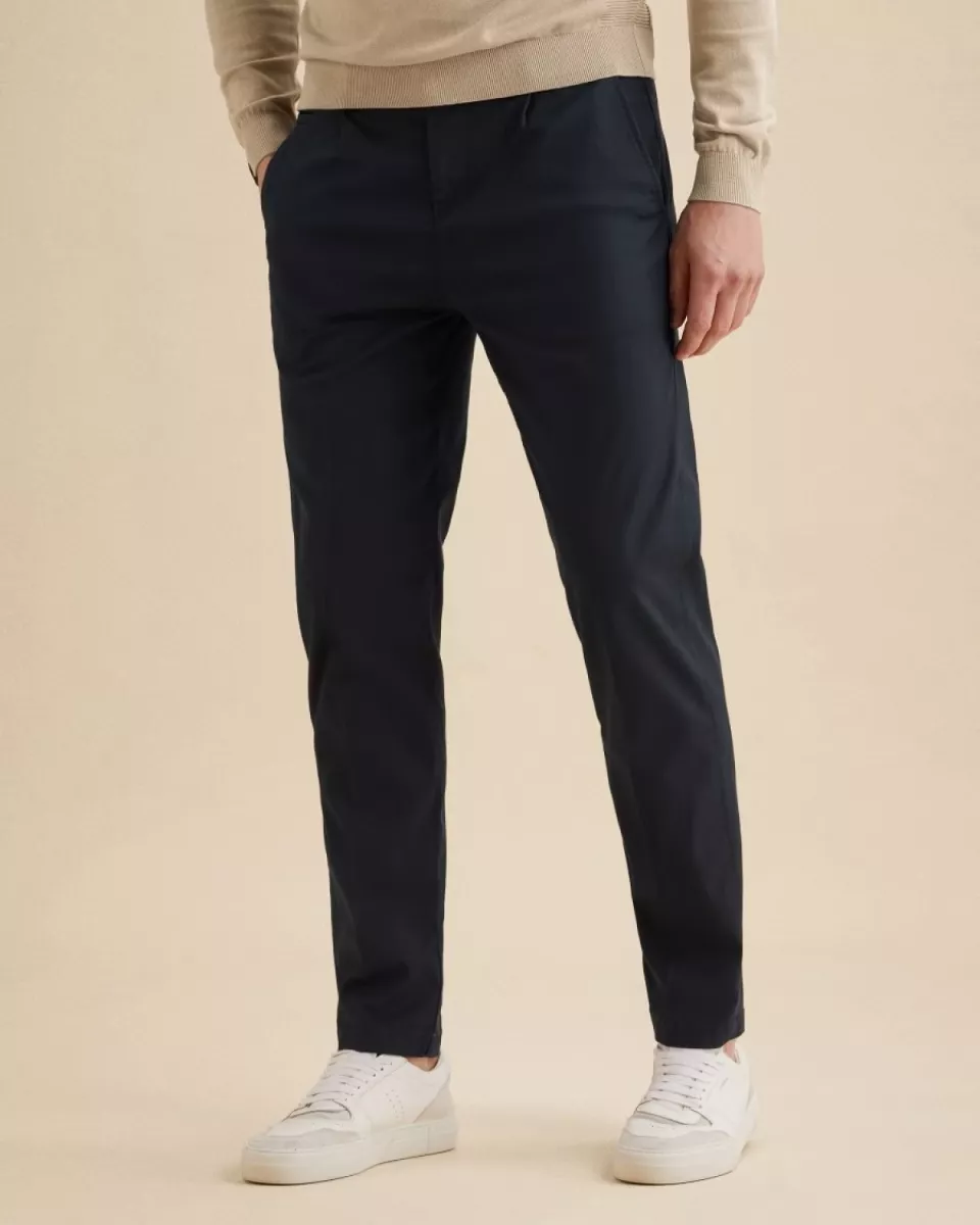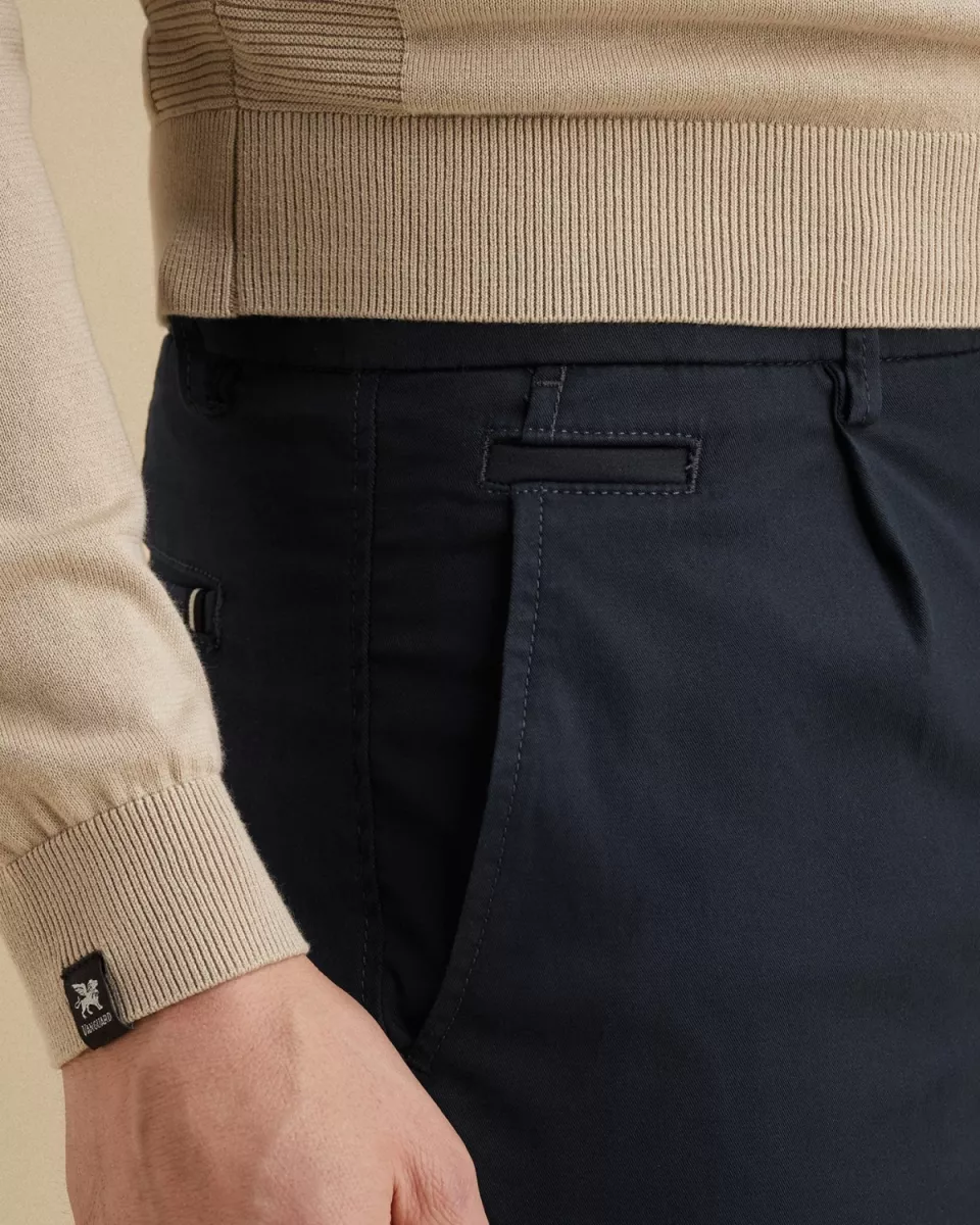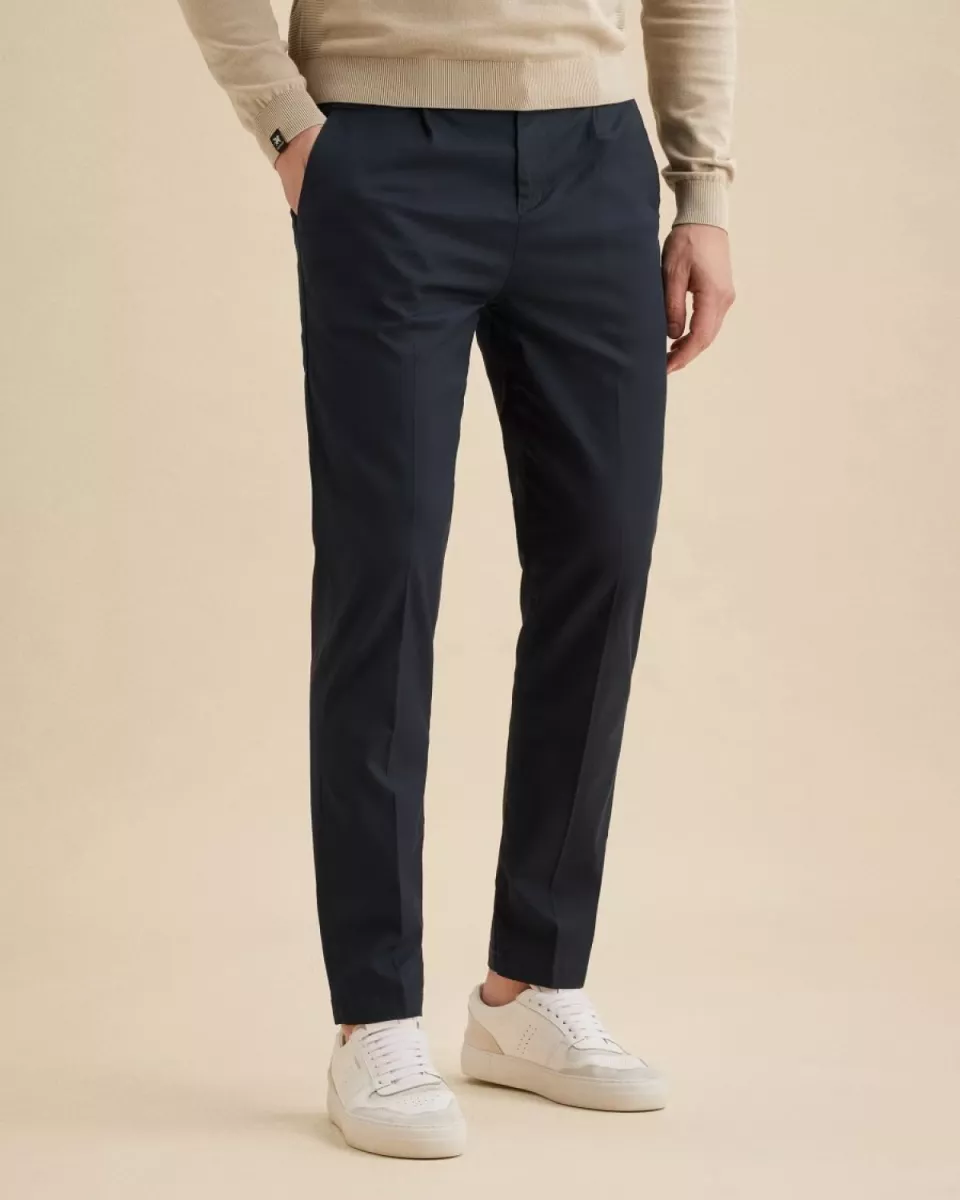 De diepe donkerblauwe kleur geeft de chino een nette en veelzijdige uitstraling, waardoor hij zowel casual als gekleed te dragen is. De katoen-Tencel blend met stretch zorgt voor een zachte, soepele stof en extra bewegingsvrijheid, ideaal voor dagelijks gebruik.