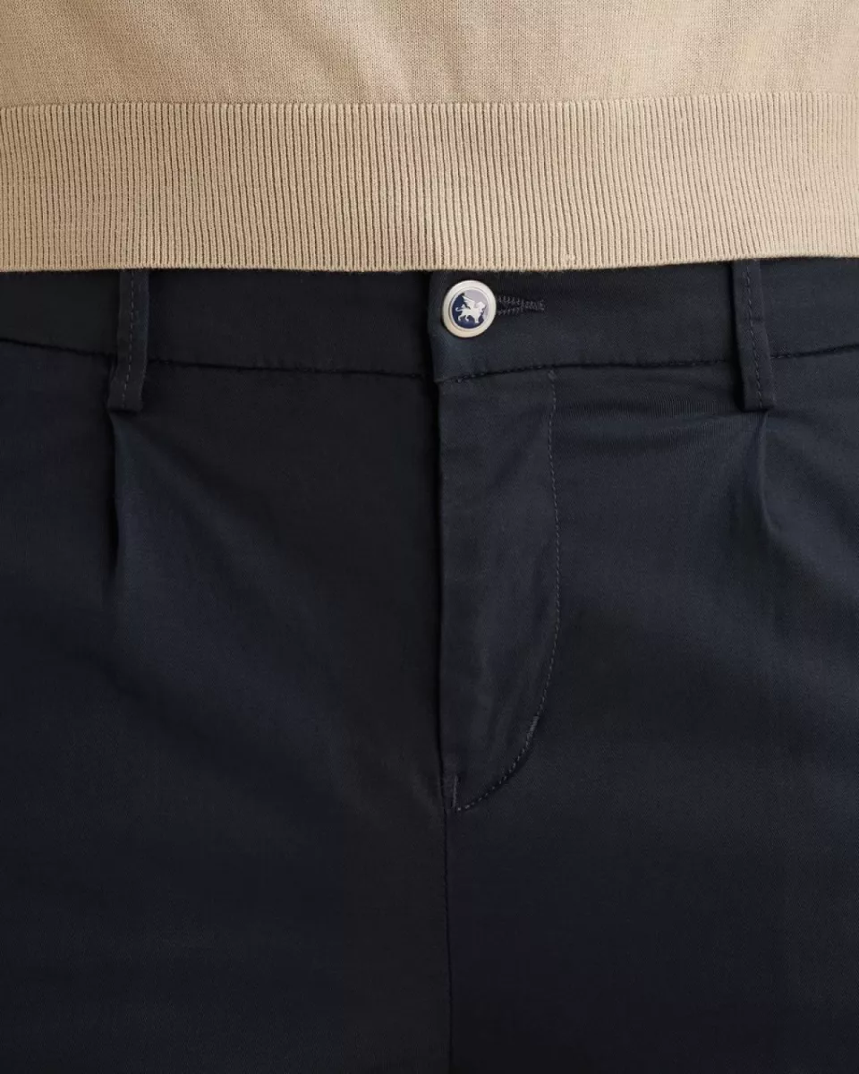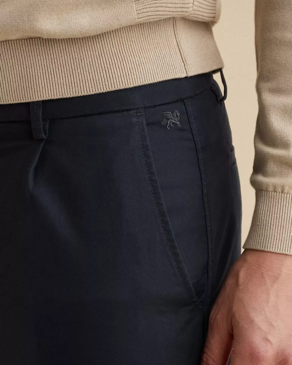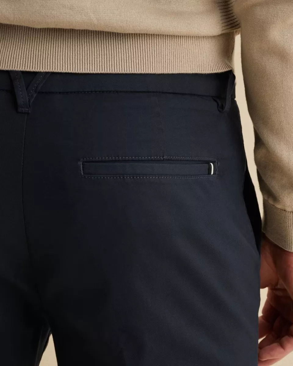 De diepe donkerblauwe kleur geeft de chino een nette en veelzijdige uitstraling, waardoor hij zowel casual als gekleed te dragen is. De katoen-Tencel blend met stretch zorgt voor een zachte, soepele stof en extra bewegingsvrijheid, ideaal voor dagelijks gebruik.
