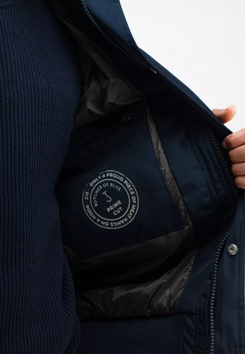 De jas is voorzien van een comfortabele, gewatteerde voering, waardoor hij heerlijk warm zit tijdens koudere dagen. De karakteristieke bomberdetails – zoals de elastische ribboorden, de kraag met klassieke vorm en de utility-geïnspireerde zakken – geven de jas een tijdloze uitstraling. Aan de binnenzijde vind je een opvallende Prime Cut branding, een subtiele knipoog naar het ambachtelijke karakter van het merk.