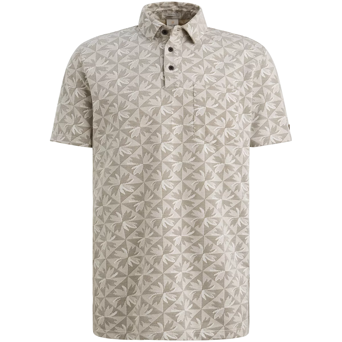 Deze Cast Iron polo voor heren combineert een stijlvolle uitstraling met een opvallend all-over motief. De polo is uitgevoerd in een lichte beige tint met een subtiel geometrisch bloemenpatroon dat over het hele shirt terugkomt. Dit patroon geeft de polo een unieke en moderne uitstraling, terwijl de neutrale kleur ervoor zorgt dat het item toch makkelijk te combineren blijft.