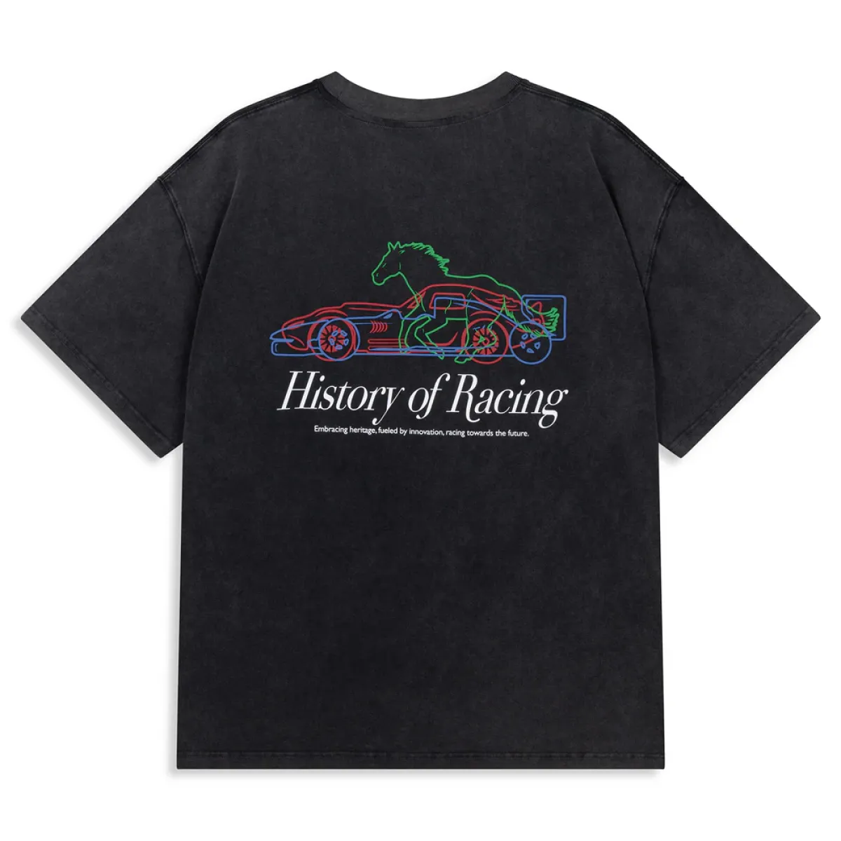 De Collectiq History Tee in faded black is zo’n T-shirt dat direct opvalt door zijn unieke uitstraling en sterke graphic. De gewassen zwarte kleur geeft het shirt een vintage look, terwijl de opvallende print op de rug – met een knipoog naar de evolutie van snelheid en innovatie – zorgt voor een echte statement piece. Op de borst vind je een subtiel Collectiq logo, wat het geheel mooi in balans houdt.
