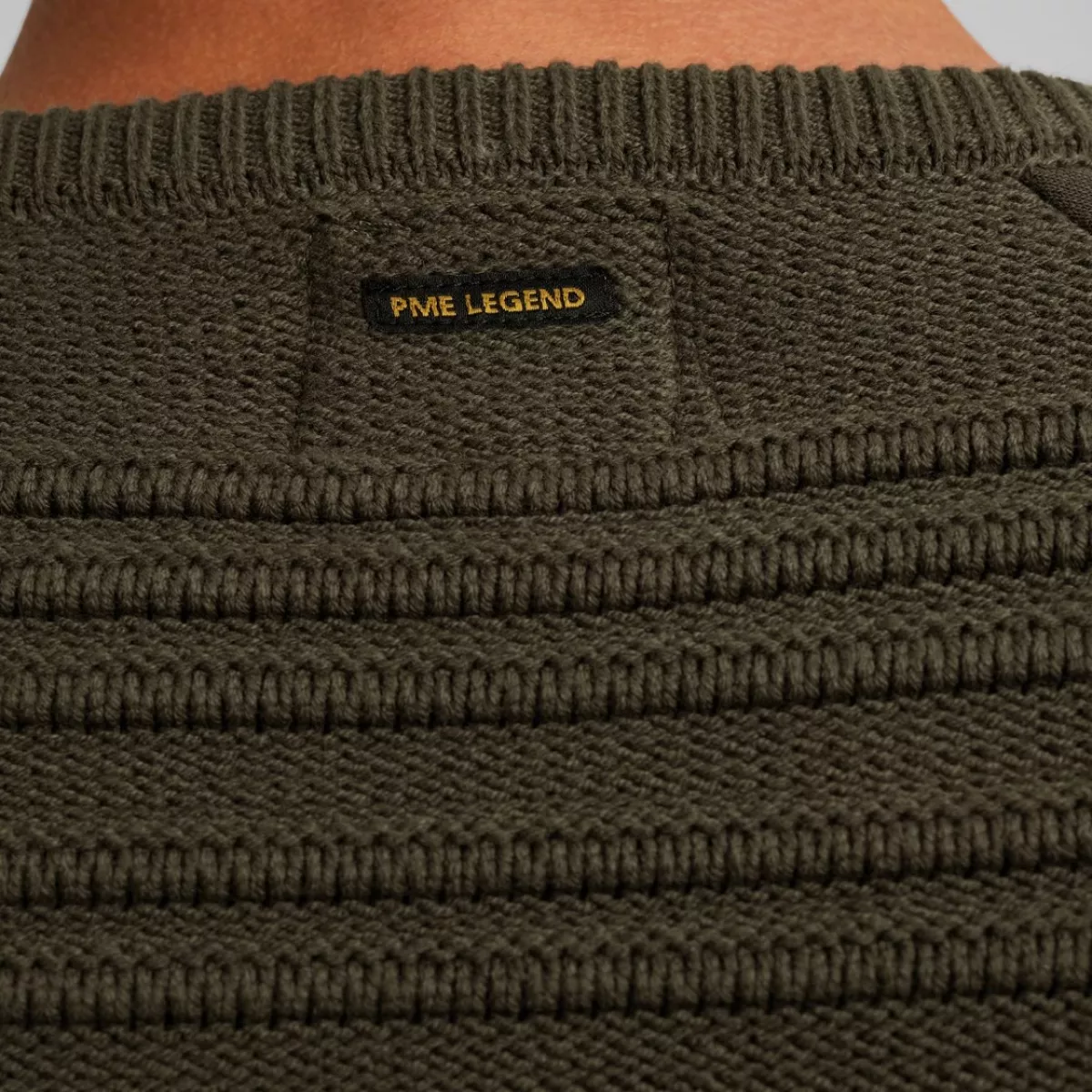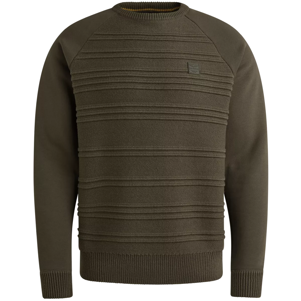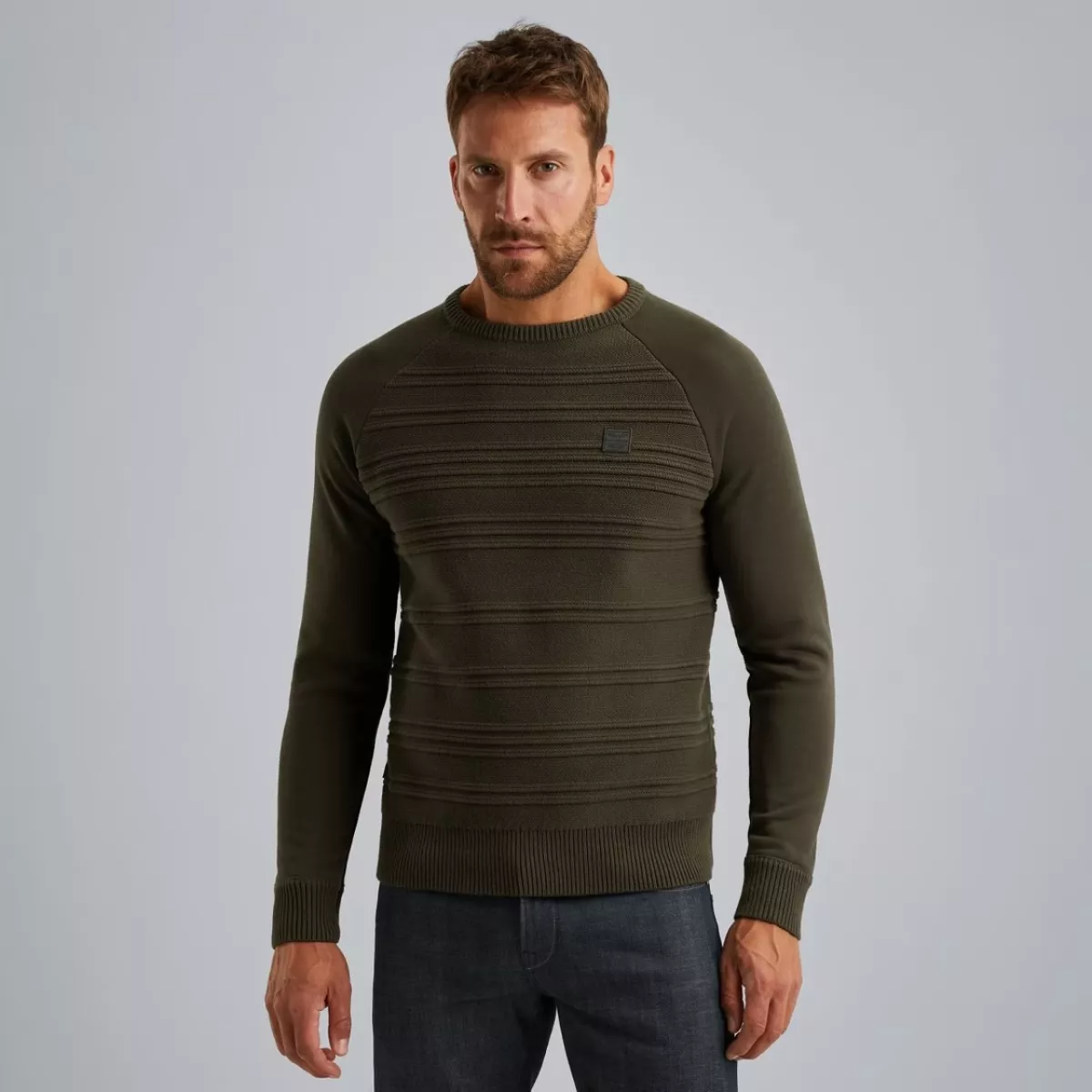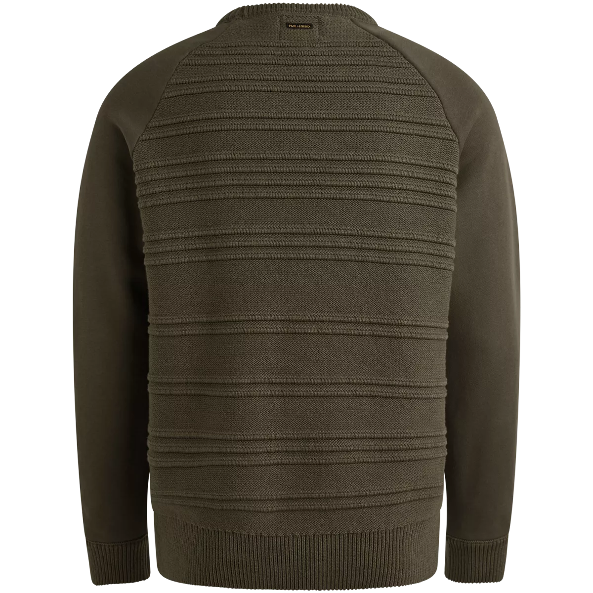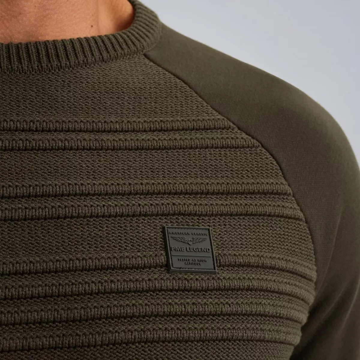 Deze PME Legend trui is zo’n item dat je meteen pakt als je ’s ochtends niet hoeft na te denken over je outfit. De stoere olijfgroene kleur past werkelijk overal bij en de combinatie van verschillende breistructuren geeft de trui nét dat beetje extra. De raglanmouwen zorgen voor een comfortabele fit en de mix van gebreid voorpand met gladde mouwen maakt ’m uniek en modern — typisch PME.