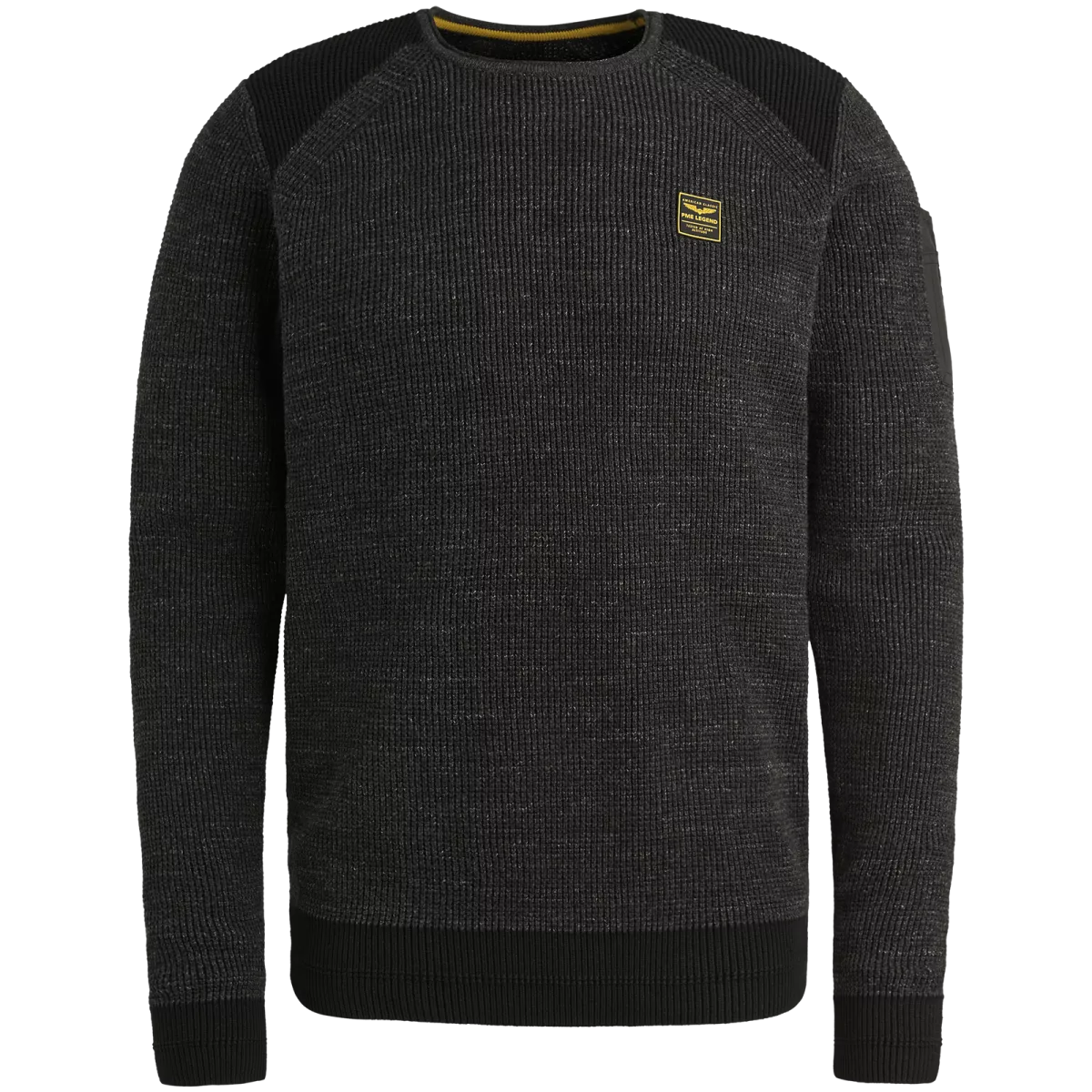Het gele PME-badge op de borst steekt mooi af tegen het donkere breisel en geeft de trui net dat beetje extra karakter. Door de regular fit zit hij comfortabel zonder te wijd te vallen — precies zoals veel mannen het fijn vinden.