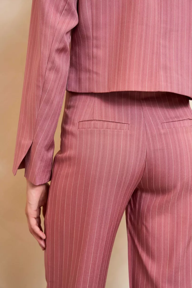 De Norelle blazer van Lofty Manner is een elegante dames blazer met een moderne en vrouwelijke uitstraling. Deze mauve pink blazer heeft een rechtvallende pasvorm en subtiele schoudervullingen, waardoor het jasje een krachtige maar stijlvolle look krijgt. De fijne krijtstreep en lichte glans in de stof geven de blazer een verfijnde en luxe uitstraling.