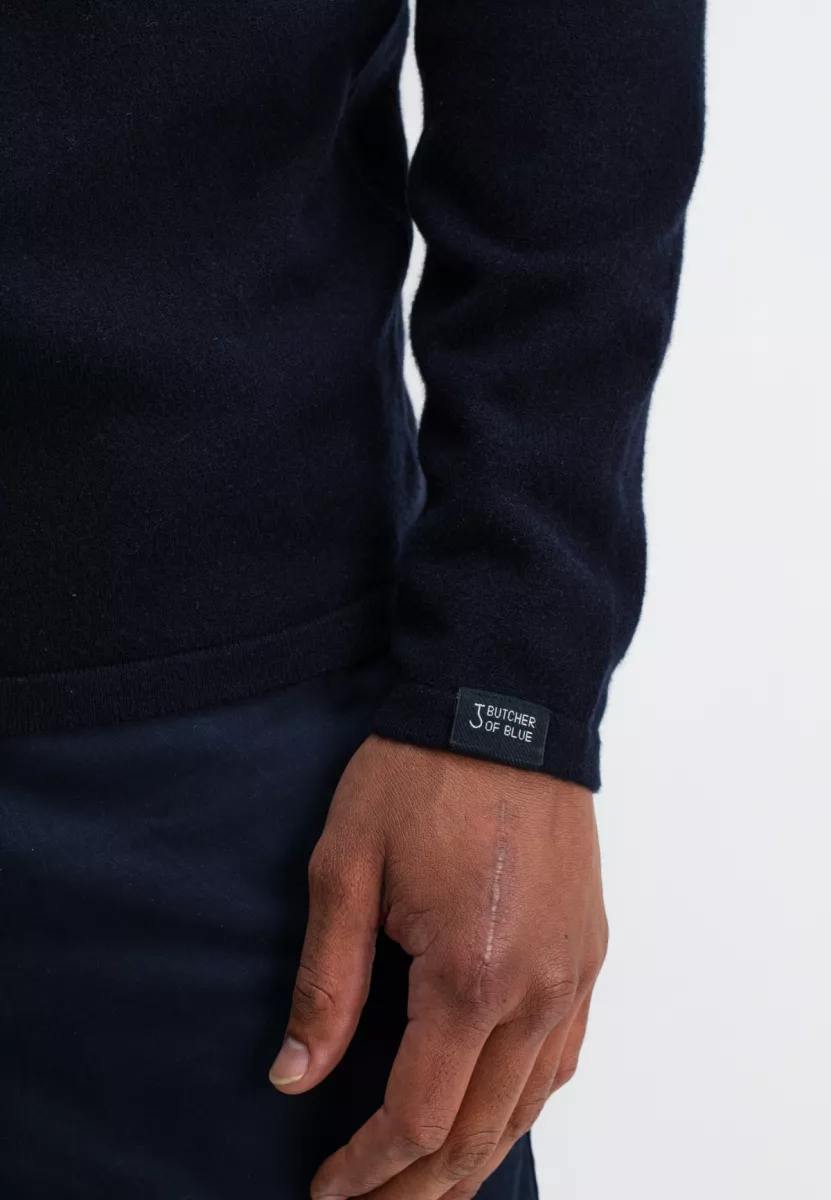 De compositie van het breisel is wat onze Clifden uniek maakt. Door 43% wol, 21% polyester, 20% viscose, 16% Polyamide te mengen hebben we nogal letterlijk het beste uit verschillende werelden samengebracht, hierdoor is deze trui zacht, warm, duurzaam en stijlvol. De trui heeft een polo kraag en is voorzien van een stoere knoopsluiting. De butcher ‘hook badge’ maakt het artikel op een subtiele manier af.