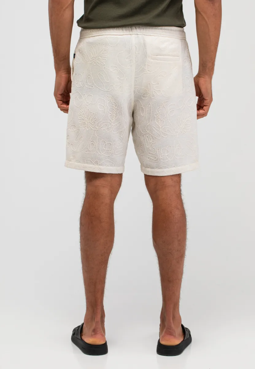 De Alex Embro short van Butcher of Blue is dé perfecte zomershort met een unieke twist. De off white kleur in combinatie met de subtiele, zonnige borduurprint geeft dit item een frisse en luxe uitstraling. De stof voelt superzacht aan en draagt heerlijk licht op warme dagen. De elastische tailleband met trekkoord zorgt voor extra comfort, terwijl de relaxed fit precies is wat je verwacht van dit stoere merk.