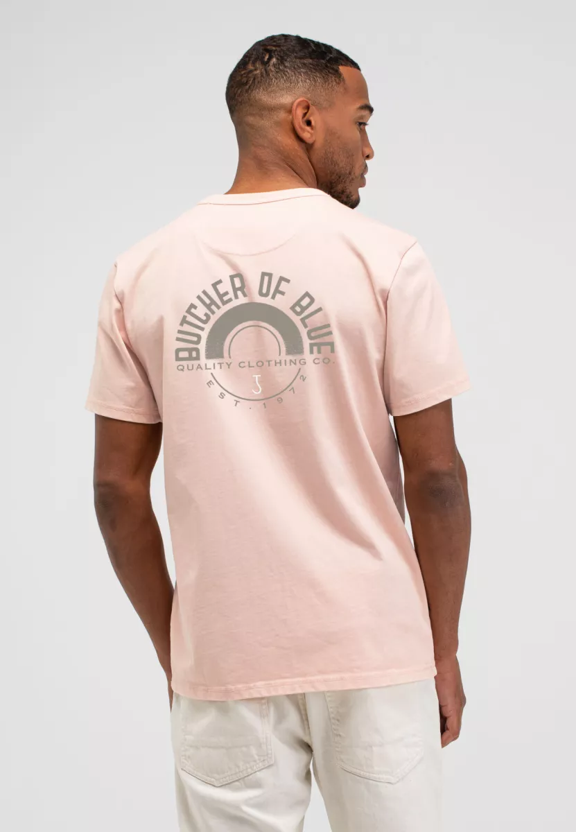 Op de borst staat een subtiele Butcher of Blue cirkelprint, terwijl de achterkant voorzien is van een grotere grafische print met het Butcher of Blue logo en de tekst Quality Clothing Co. EST. 1972. Dit geeft het shirt een stoere en herkenbare uitstraling die goed past binnen de stijl van het merk.