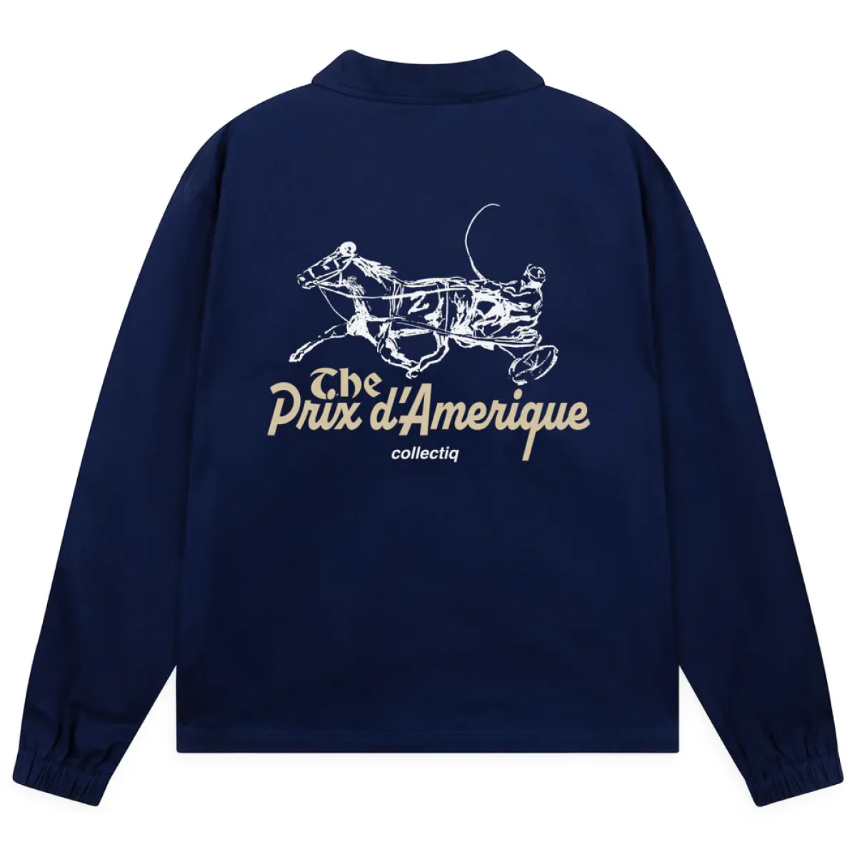 De Collectiq Trotting Prix Coach Jacket in delft blue is een echte statement jas met een sportieve en artistieke uitstraling. De diepe blauwe kleur geeft de jas een luxe en frisse look, terwijl de geborduurde Trotting Prix graphic op de borst en rug zorgt voor een uniek en herkenbaar design.