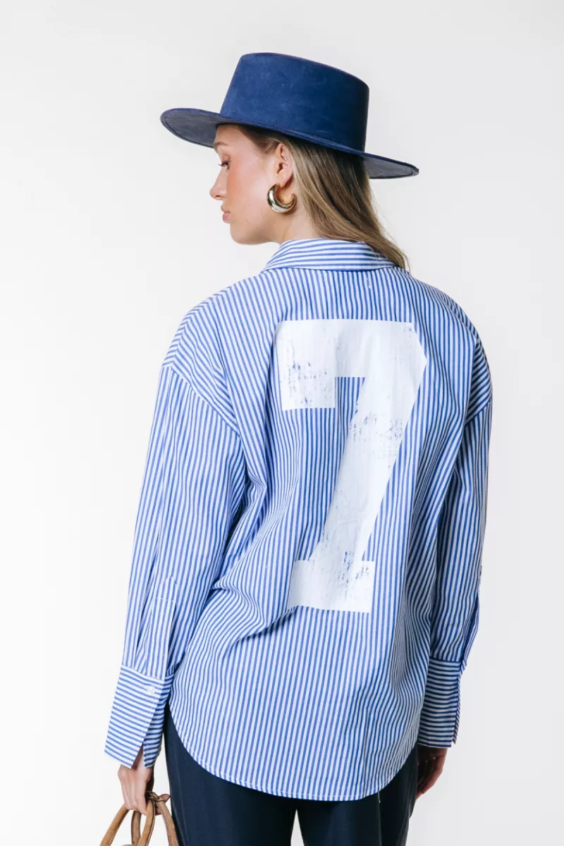 De Colourful Rebel button down blouse is een echte eyecatcher binnen je voorjaarsgarderobe. De blauw-witte streep geeft deze dames blouse een frisse, tijdloze uitstraling, terwijl de grote ‘7’ print op de rug zorgt voor een stoer en speels accent. De blouse heeft een regular fit en valt losjes om het lichaam, waardoor je ‘m zowel casual als iets netter kunt dragen.
