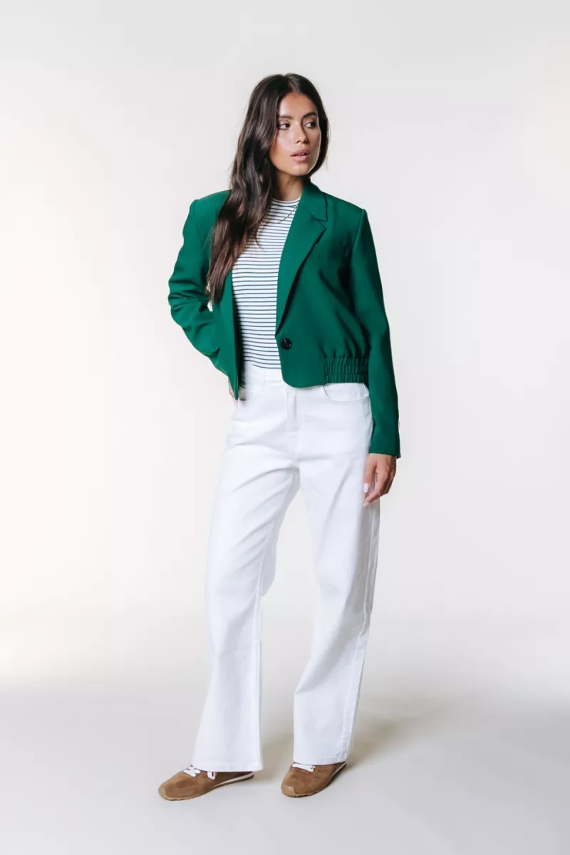 De Zoe Gathered Bottom Blazer van Colourful Rebel is een stijlvolle en moderne blazer met een sportieve twist. Deze cropped dames blazer uit de Colourful Rebel Spring/Summer collectie combineert een klassieke blazer look met een trendy en vrouwelijke pasvorm. De prachtige groene kleur geeft het item een frisse en opvallende uitstraling die perfect past bij het seizoen.