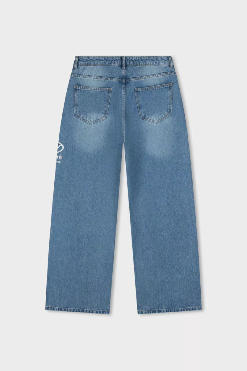 De blauwe denim wassing geeft de broek een tijdloze basis, terwijl het geborduurde Equalité Arid logo op het linkerbeen zorgt voor een herkenbaar detail. De klassieke indeling met twee steekzakken en twee achterzakken maakt deze jeans niet alleen stijlvol, maar ook praktisch.