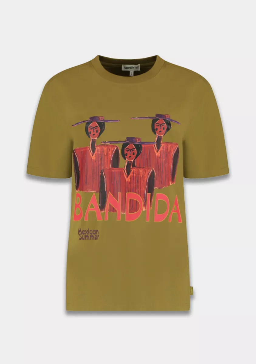De BANDIDA T-shirt van Harper & Yve in de kleur avocado is een echte eyecatcher binnen je zomergarderobe. Dit dames T-shirt is uitgevoerd in een frisse groentint en voorzien van een opvallende frontprint die direct karakter geeft aan je outfit. De relaxte pasvorm zorgt voor een nonchalante, comfortabele look, terwijl het 100% organic cotton materiaal zacht aanvoelt op de huid. Een duurzaam en stijlvol item dat perfect past binnen de nieuwe Harper & Yve collectie.