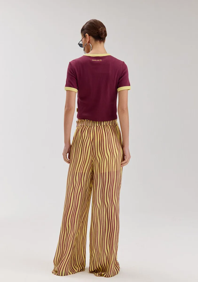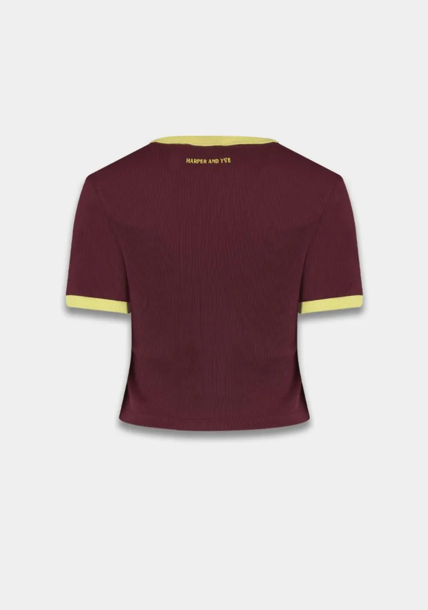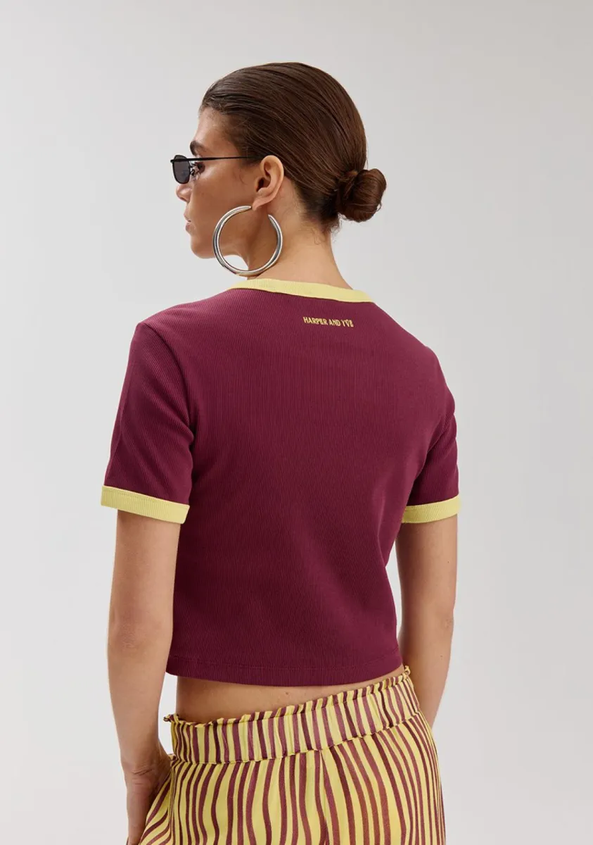 De Harper & Yve Sombra T-shirt in cassis is een trendy en vrouwelijke crop top met een sportieve uitstraling. De aangesloten pasvorm en korte lengte zorgen voor een moderne fit, terwijl de diepe cassis kleur gecombineerd met de contrasterende details een opvallende look geeft.