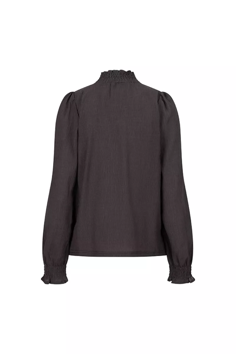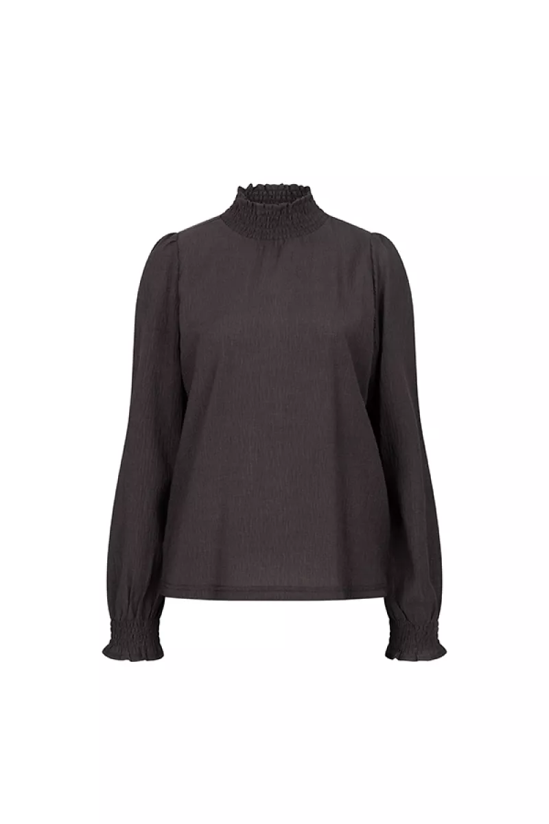 Blouse Tova is een donkergrijze top. De blouse heeft smockdetails bij zowel de hoge kolkraag als mouwuiteinden. Verder heeft de grijze blouse subtiele pofmouwen en is de blouse qua pasvorm rechtvallend.