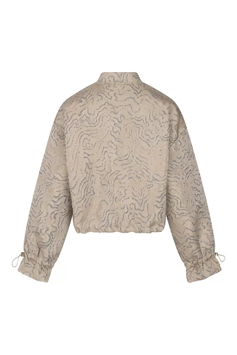 De Brienna jacket van Lofty Manner is een stijlvolle en opvallende dames jas met een moderne uitstraling. Dit zilverkleurige jacket heeft een oversized pasvorm en een opstaande kraag, wat zorgt voor een trendy en eigentijdse look. De jacquard stof met subtiel patroon geeft het jasje een luxe uitstraling en maakt het een bijzonder item binnen je garderobe.