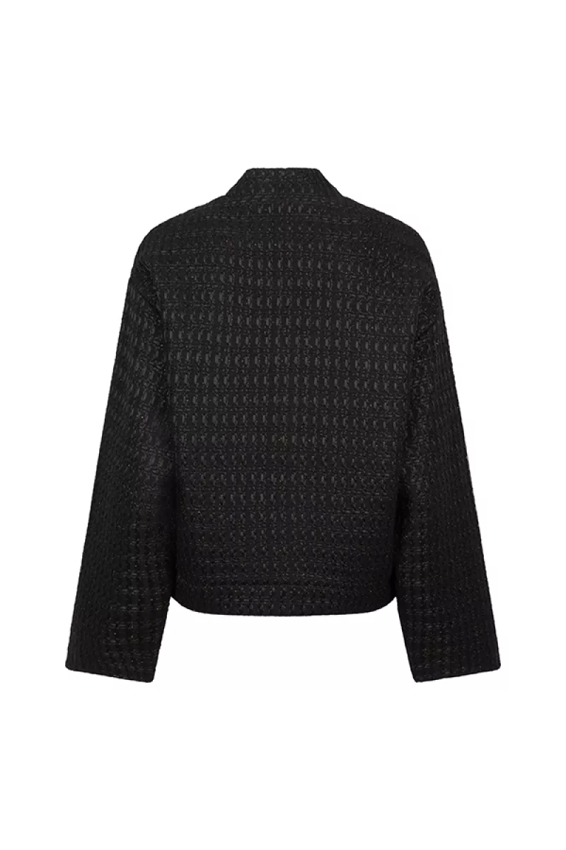 Jacket Nadine is een zwart jasje van tweed stof met boxy fit. Het jasje heeft een ronde hals, knoop- en ritssluiting en flap pockets. Het zwarte jasje heeft een subtiele glinstering dankzij de lurexdetails.