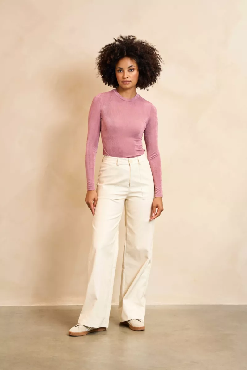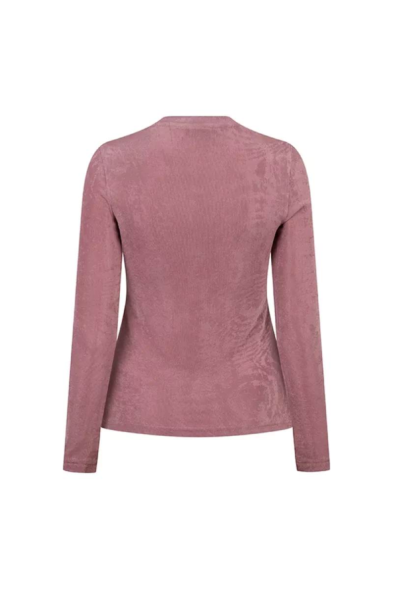 De Arlina top van Lofty Manner is een elegante en veelzijdige dames top met een subtiele glans. Deze mauve pink top heeft een ronde hals, lange mouwen en een aangesloten pasvorm die mooi aansluit op het lichaam. De zachte stretchy knit zorgt voor een comfortabele fit, terwijl de subtiele shimmer in de stof een verfijnde en vrouwelijke uitstraling geeft.