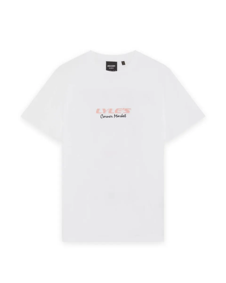 Op de borst vind je een subtiele “Lyle’s Corner Market” print, terwijl de achterkant is voorzien van een grote receipt graphic met zachte roze accenten. Dit geeft het T-shirt een moderne en speelse uitstraling.