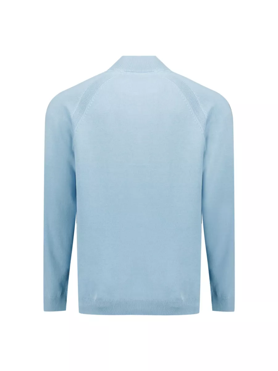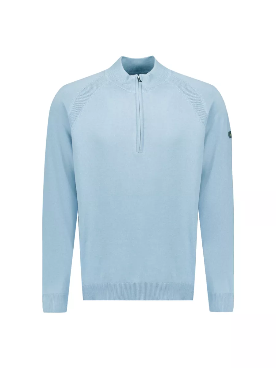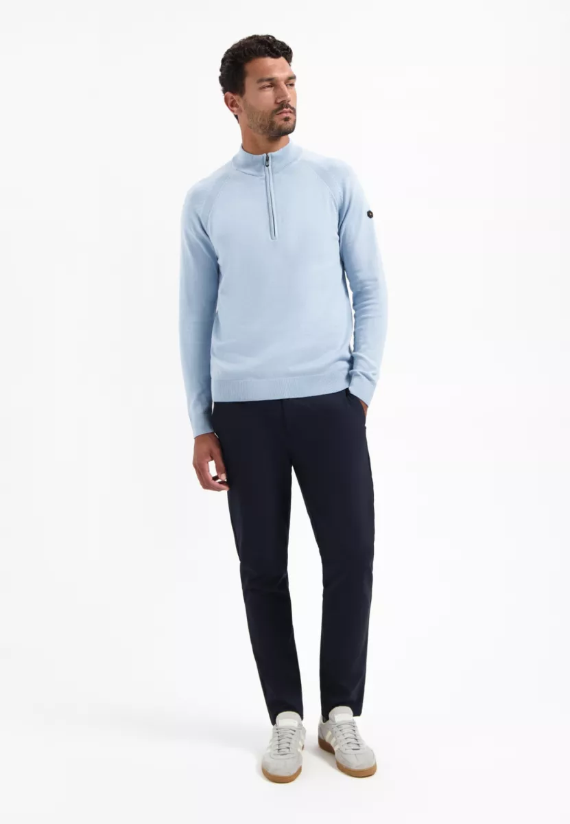 De lichtblauwe kleur geeft je outfit direct een frisse uitstraling. Combineer deze pullover met een donkere jeans en witte sneakers voor een moderne casual look. Voor een meer verzorgde stijl draag je hem met een beige of navy chino en nette schoenen. De half-zip maakt het makkelijk om te spelen met je look: iets open voor relaxed, volledig gesloten voor een strakkere uitstraling.