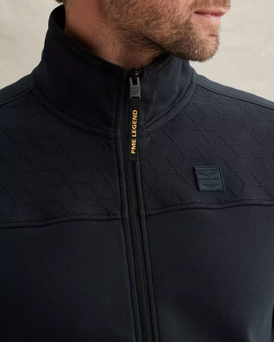 De jas onderscheidt zich door de verschillende structuren in de stof, wat zorgt voor die herkenbare PME Legend-signatuur. Het tapedetail op de mouw en de subtiele branding geven het sweat jacket een robuuste afwerking. Dankzij de zijzakken met rits neem je je essentials veilig en praktisch mee.
