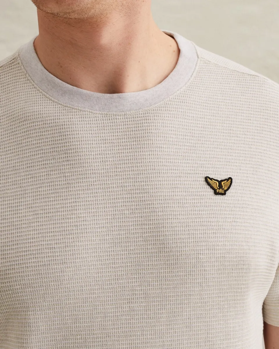 De combinatie van textuur en kleur geeft dit T-shirt net wat meer diepte dan een standaard basic. De herkenbare PME Legend badge op de borst maakt het design compleet en zorgt voor die kenmerkende, robuuste look van het merk.