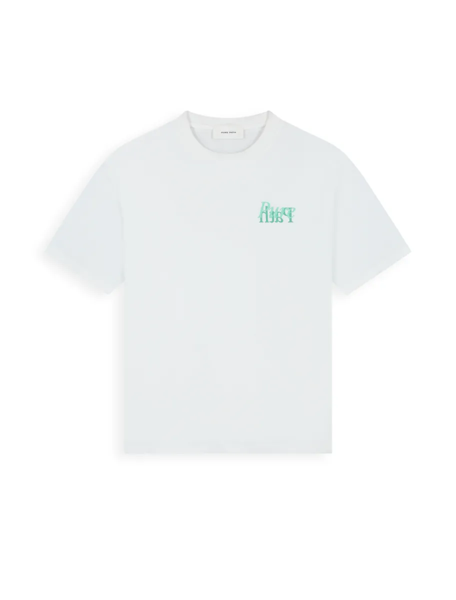 Dit lichtgrijze Mirror Logo T-shirt van Pure Path is een frisse en moderne toevoeging aan je zomergarderobe. De zachte kleur in combinatie met het mintgroene logo op de borst geeft het shirt een cleane en eigentijdse uitstraling. De achterkant maakt het geheel af met een grote, opvallende graphic die zorgt voor een krachtig statement zonder te overheersen.