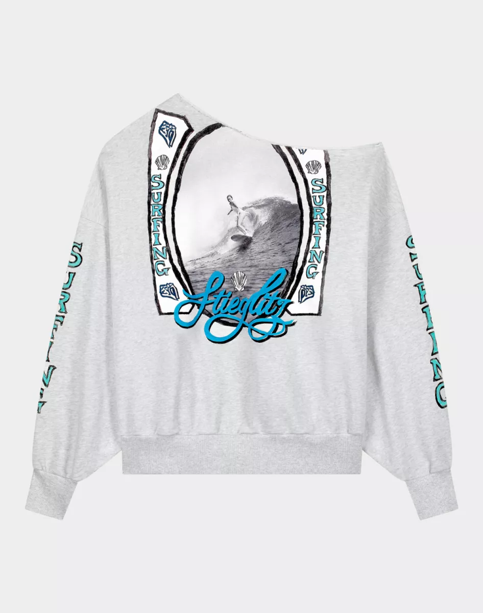 De Winny Off-Shoulder Oversized Sweater van Stieglitz is een statement sweater met een relaxte en vrouwelijke uitstraling. Deze grijze oversized sweater heeft een off-shoulder halslijn met een raw-cut afwerking, wat zorgt voor een nonchalante en moderne look. Op de achterkant staat een grote surf-geïnspireerde print met het iconische Stieglitz logo, waardoor het item direct opvalt.