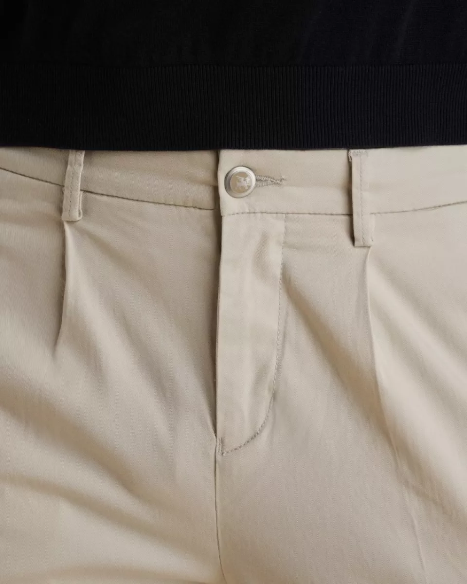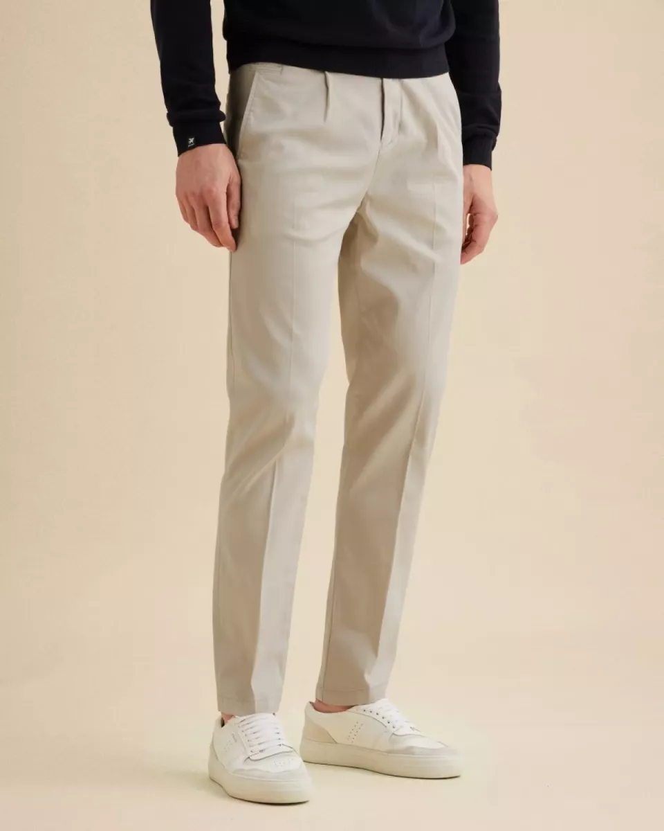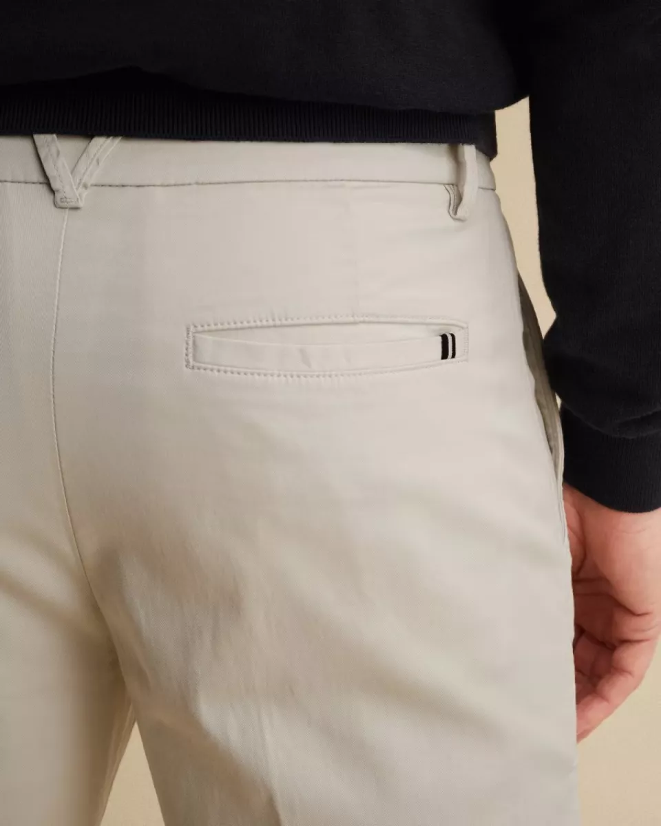 De lichte beige kleur geeft de chino een frisse en veelzijdige look die perfect past bij het voorjaar en de zomer. Dankzij de katoen-Tencel blend met stretch voelt de stof zacht en soepel aan en biedt deze veel bewegingsvrijheid.